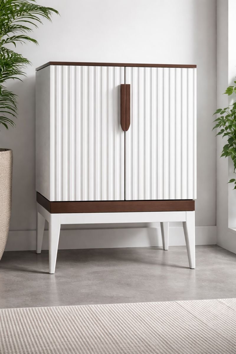 Il se compose d’un caisson rectangulaire reposant sur quatre pieds légèrement évasés, qui lui confèrent une silhouette légère et élégante. Les façades sont habillées de panneaux blancs à rainures verticales, apportant du relief et une touche graphique moderne. Le plateau supérieur et le socle inférieur sont réalisés dans une finition bois foncé, créant un contraste chaleureux avec le blanc dominant.