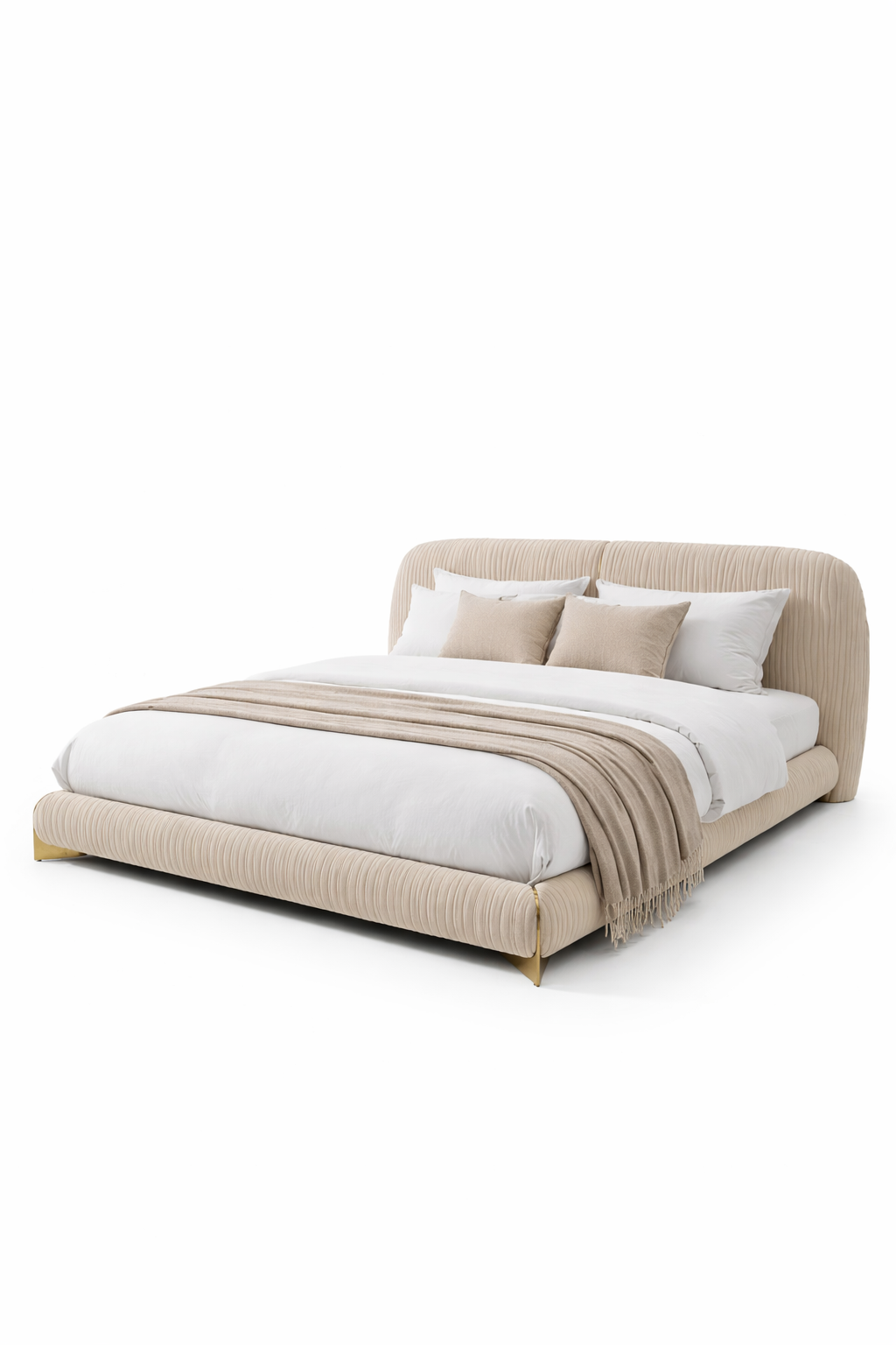 La tête de lit large et arrondie, aux lignes verticales délicatement travaillées, offre un excellent maintien tout en servant d’élément décoratif fort. Le cadre bas et enveloppant crée une allure épurée et stable, parfaite pour une ambiance chic et minimaliste.
