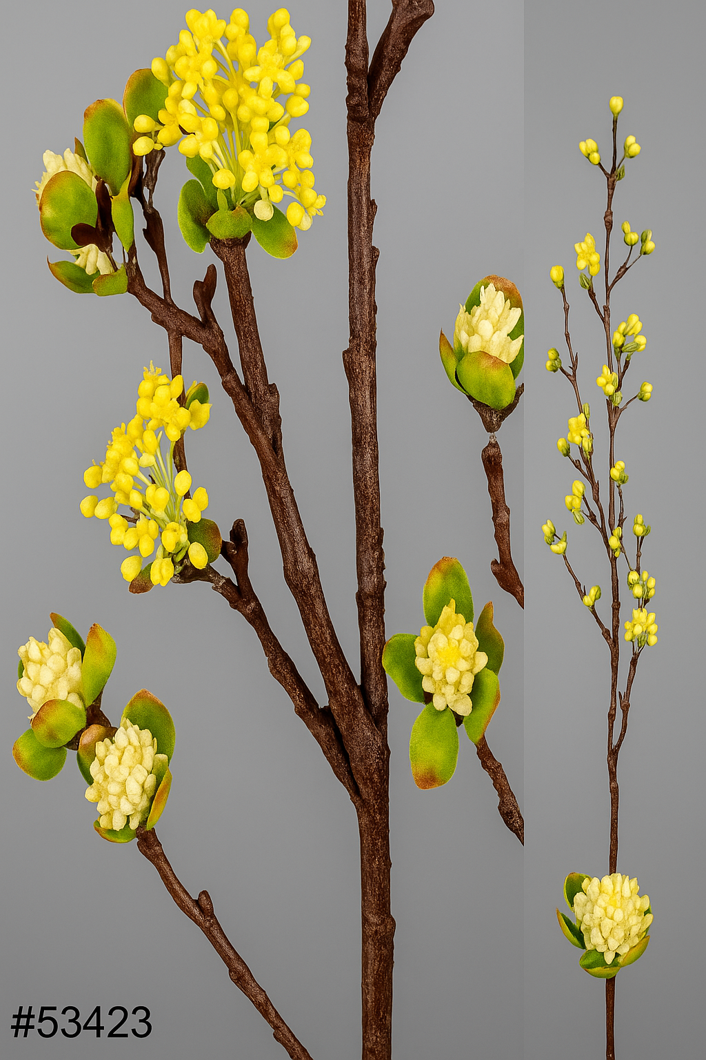 Branche artificielle Rama Melocotonero Amarilla – Élégante et lumineuse, cette tige décorative imite à la perfection une branche de pêcher en fleurs. Ses délicates fleurs jaunes et ses feuilles vert tendre apportent une touche printanière et naturelle à vos compositions florales ou à vos vases. Idéale pour illuminer votre intérieur sans entretien.