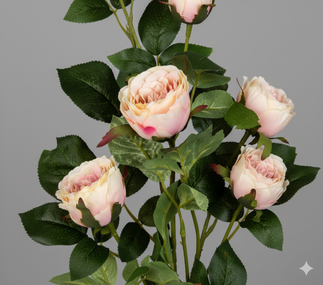 Apportez une touche d’élégance intemporelle avec cette branche de roses artificielles au style romantique. Ses fleurs luxuriantes aux nuances poudrées de rose et crème, associées à un feuillage réaliste, imitent parfaitement la beauté des roses naturelles.