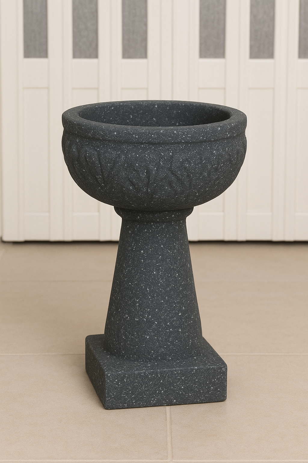• Matière : pierre artificielle granitée, gris foncé moucheté de blanc.