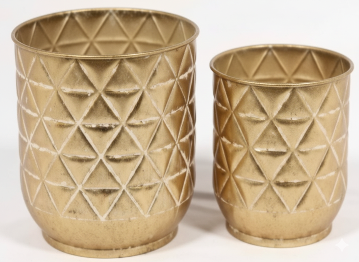 Ce set se compose de deux cache-pots ronds de tailles différentes, au design raffiné et élégant. Fabriqués en métal, ils arborent une finition dorée vieillie subtilement patinée, qui combine charme antique et touche moderne.