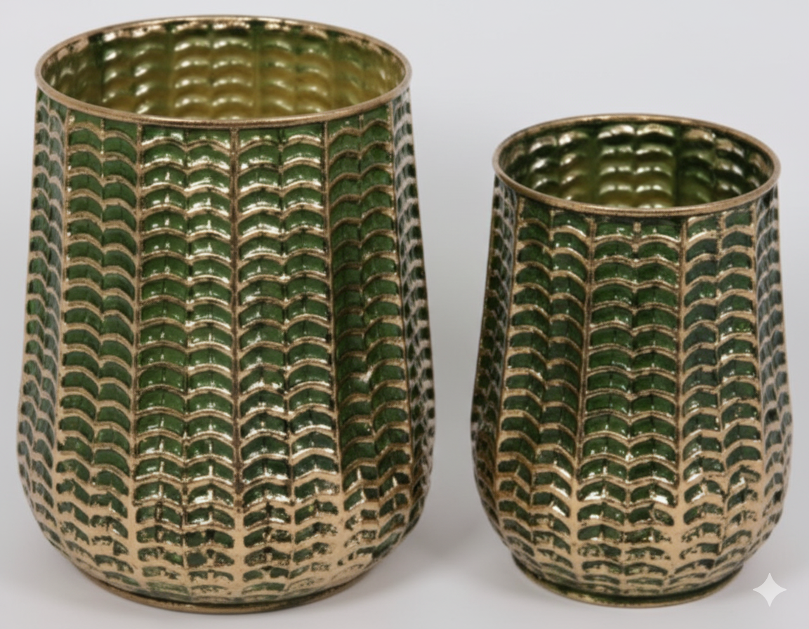 Ce set décoratif comprend deux cache-pots de tailles différentes au design raffiné. Leur teinte vert bouteille profonde est sublimée par des motifs en relief dorés, évoquant un maillage ou des écailles, pour un rendu sophistiqué et original.
