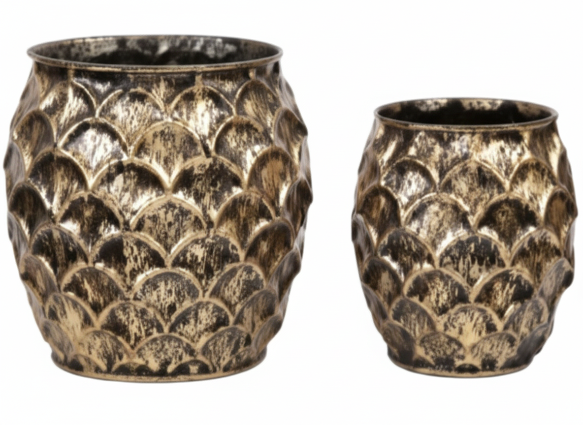 Ce set se compose de deux cache-pots de tailles différentes, assortis dans un style à la fois chic et rustique. Fabriqués en métal, ils arborent une finition vieillie qui combine des teintes dorées et noires, leur conférant un aspect patiné et artisanal.
