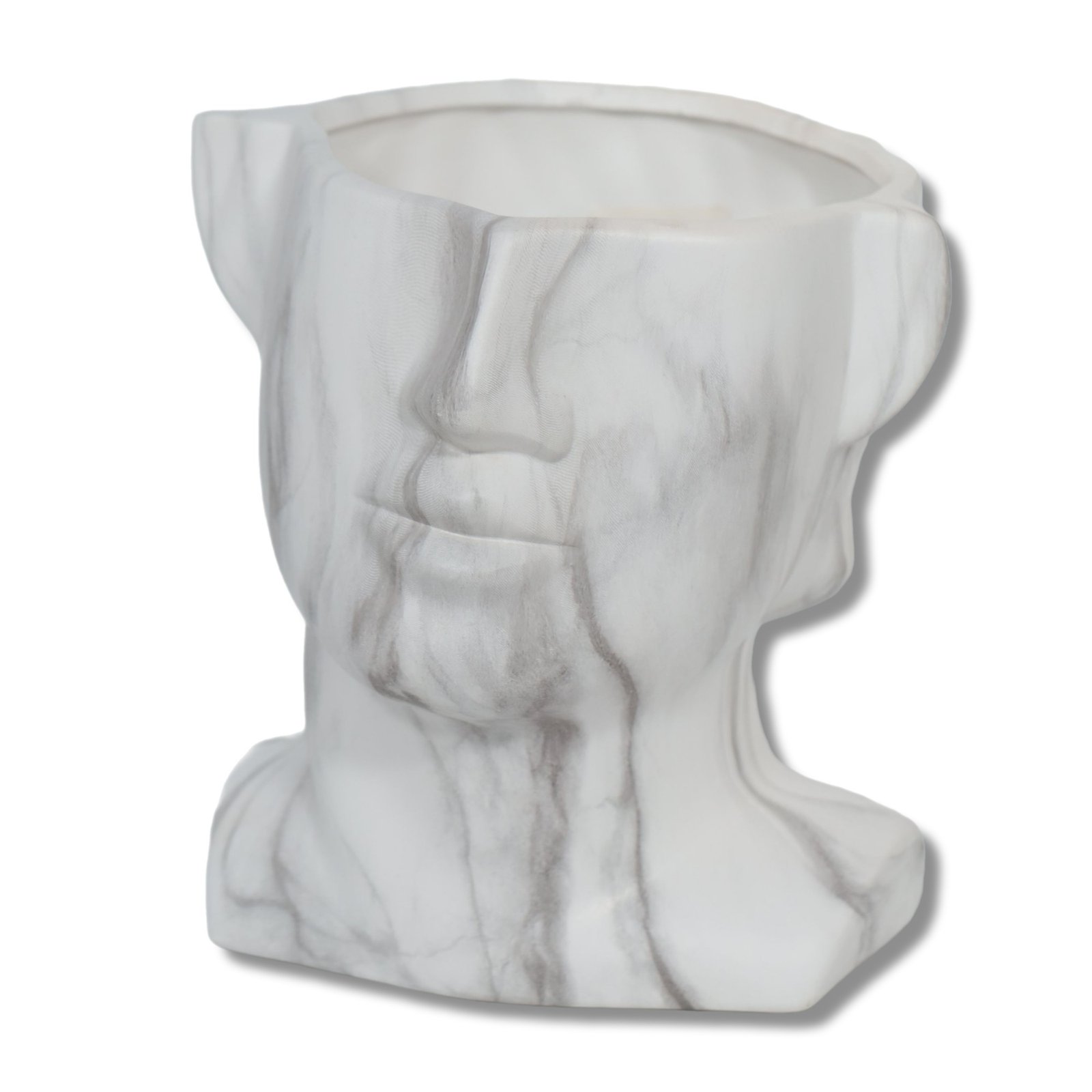 Ce cache-pot en résine imite l’apparence du marbre avec un effet veiné en gris sur fond blanc, conférant une allure élégante et raffinée. Il est façonné en forme de tête sculptée, avec des traits masculins stylisés : nez, bouche et menton bien définis, tandis que le sommet est ouvert pour accueillir une plante. Les oreilles sont légèrement esquissées, et l’ensemble évoque un buste antique modernisé.