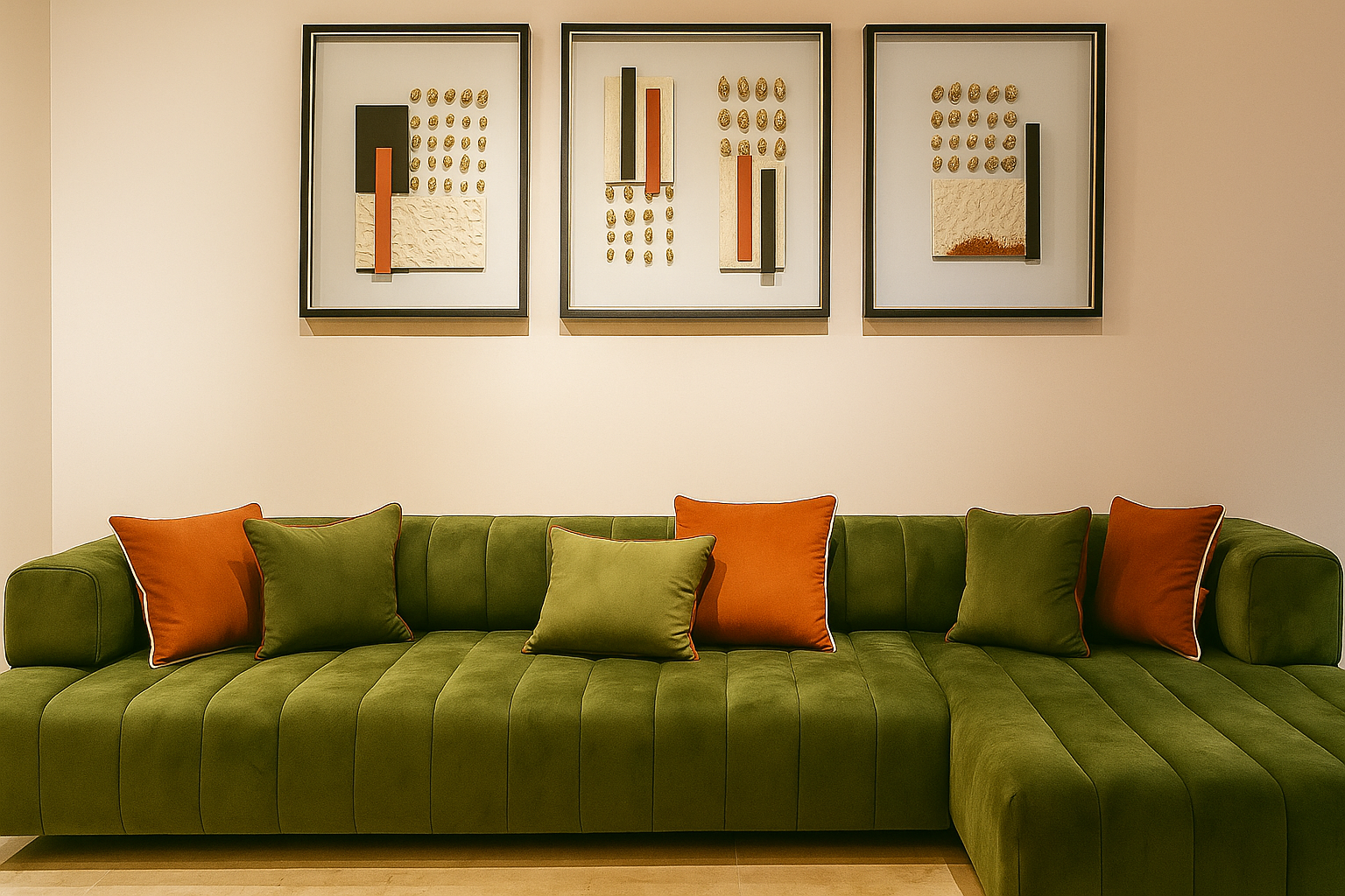 Les assises capitonnées lui donnent un aspect à la fois moderne et moelleux, tandis que ses lignes arrondies et ses accoudoirs massifs renforcent l’impression de confort. Le canapé est agrémenté de coussins décoratifs verts et terracotta, à bordure contrastée, qui ajoutent une touche raffinée et harmonieuse à l’ensemble.
