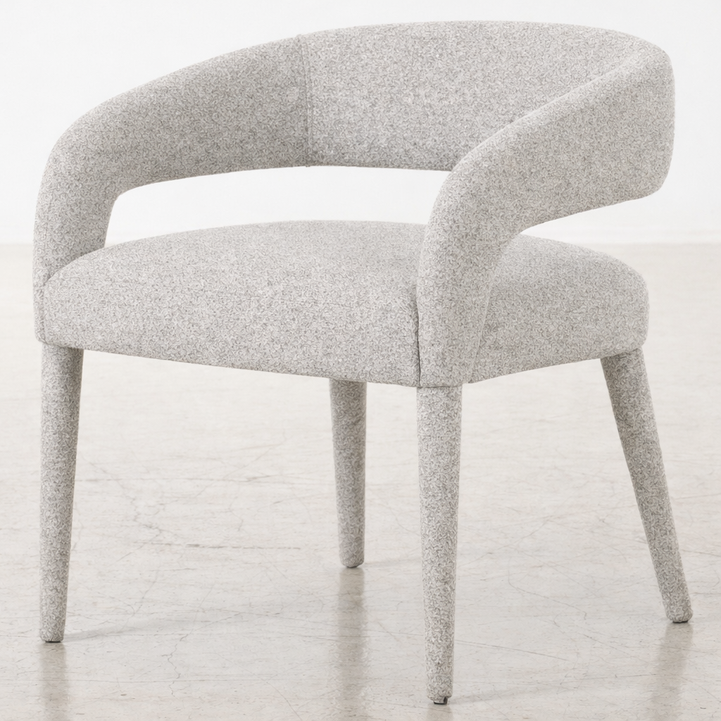 Elle se caractérise par une assise large et bien rembourrée, habillée d’un tissu texturé de couleur beige clair à gris doux, apportant une sensation chaleureuse et raffinée. Le dossier enveloppant, légèrement incurvé, se prolonge harmonieusement en accoudoirs intégrés, assurant un excellent maintien du dos et des bras tout en renforçant le confort d’assise.