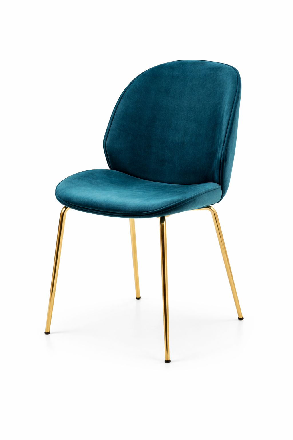 La chaise repose sur quatre pieds en métal finition dorée, fins et résistants, qui confèrent une stabilité optimale tout en apportant une touche luxueuse et tendance. Leur design épuré contraste élégamment avec la richesse du velours, créant un équilibre visuel harmonieux.
