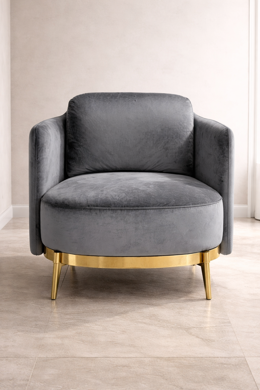 Le fauteuil repose sur une structure en métal finition dorée, qui contraste harmonieusement avec le velours gris et ajoute une touche luxueuse à l’ensemble. Cette base métallique garantit stabilité, solidité et durabilité.
