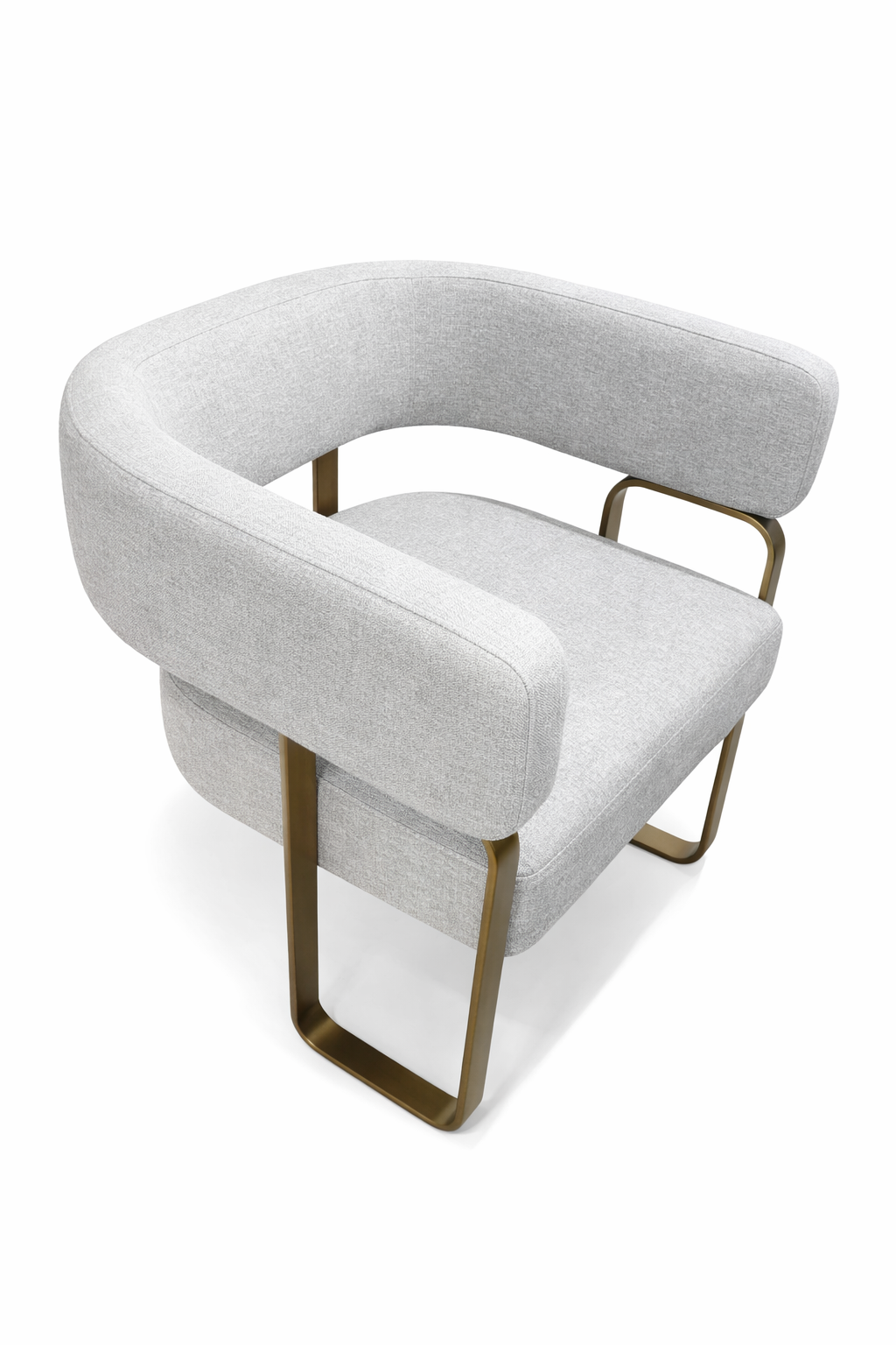 La structure repose sur des pieds en métal finition dorée, de forme en U, qui apportent une touche luxueuse et contemporaine tout en assurant solidité et stabilité. Le contraste entre le tissu clair et le piètement métallique renforce le caractère chic de la chaise.