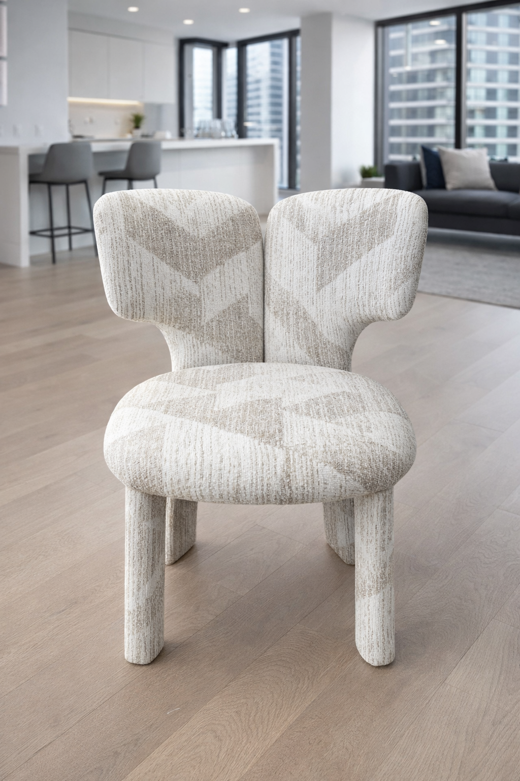 Chaise d’importation se distingue par son design moderne et original, avec un dossier double arrondi qui apporte une touche contemporaine et élégante. Elle est entièrement revêtue d’un tissu texturé dans des tons beige et écru, avec un motif géométrique discret qui renforce son aspect raffiné.