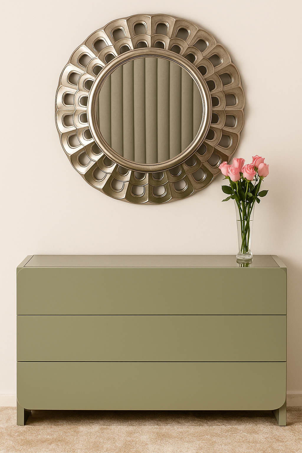 Cette commode présente un style moderne et épuré, caractérisé par des lignes douces et un design minimaliste. Elle est entièrement revêtue d’une teinte vert olive mate, qui lui confère une allure à la fois naturelle et contemporaine.