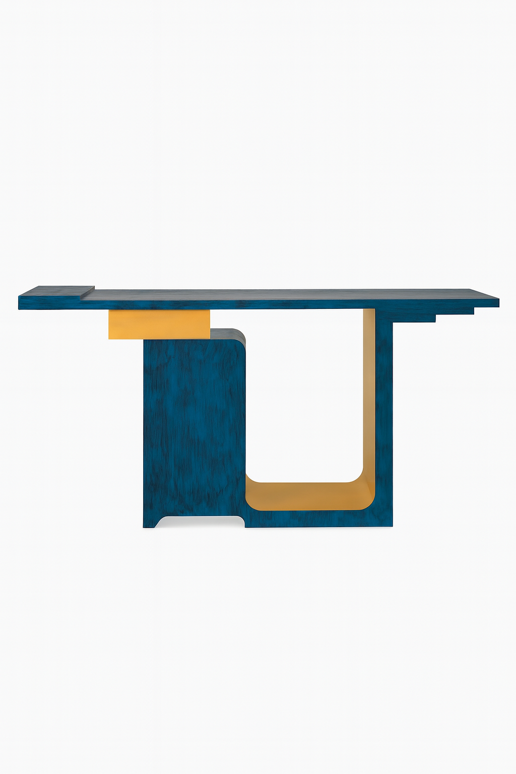 La console se caractérise par un jeu de volumes géométriques équilibrés, associant une finition bleu profond texturée à des accents dorés élégants, créant un contraste visuel fort et raffiné. La forme sculpturale de la base apporte une identité unique, faisant de cette pièce un véritable élément décoratif.
