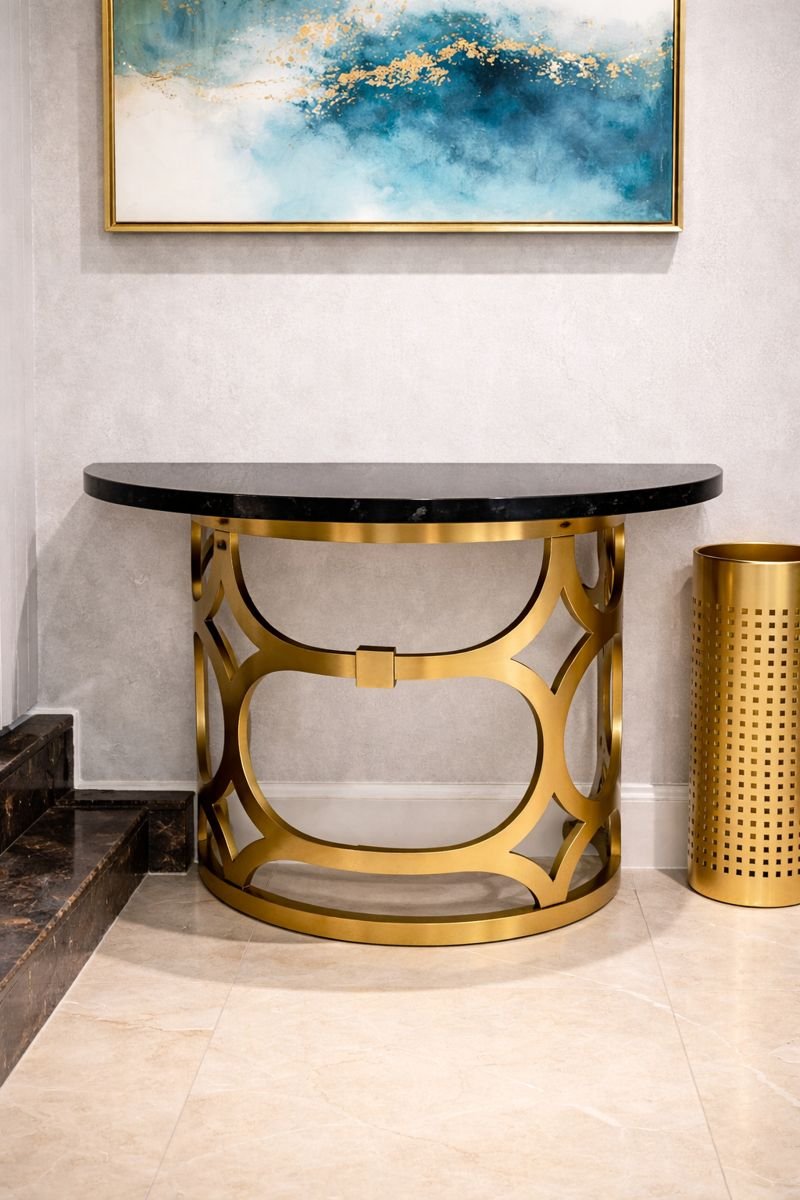 L’alliance du plateau glossy black et de la base métallique dorée confère à cette console d’importation une identité chic, élégante et résolument moderne, idéale pour des intérieurs premium.