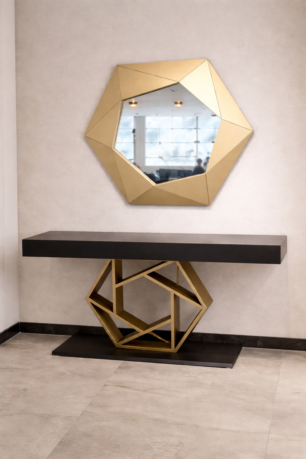 La console présente un plateau rectangulaire aux lignes épurées, finition sombre et mate, qui contraste élégamment avec sa base en métal doré. Le piètement adopte une structure géométrique sculpturale, formée de lignes angulaires entrecroisées, offrant à la fois une grande stabilité et une forte identité visuelle. L’ensemble crée un équilibre harmonieux entre robustesse et légèreté esthétique.