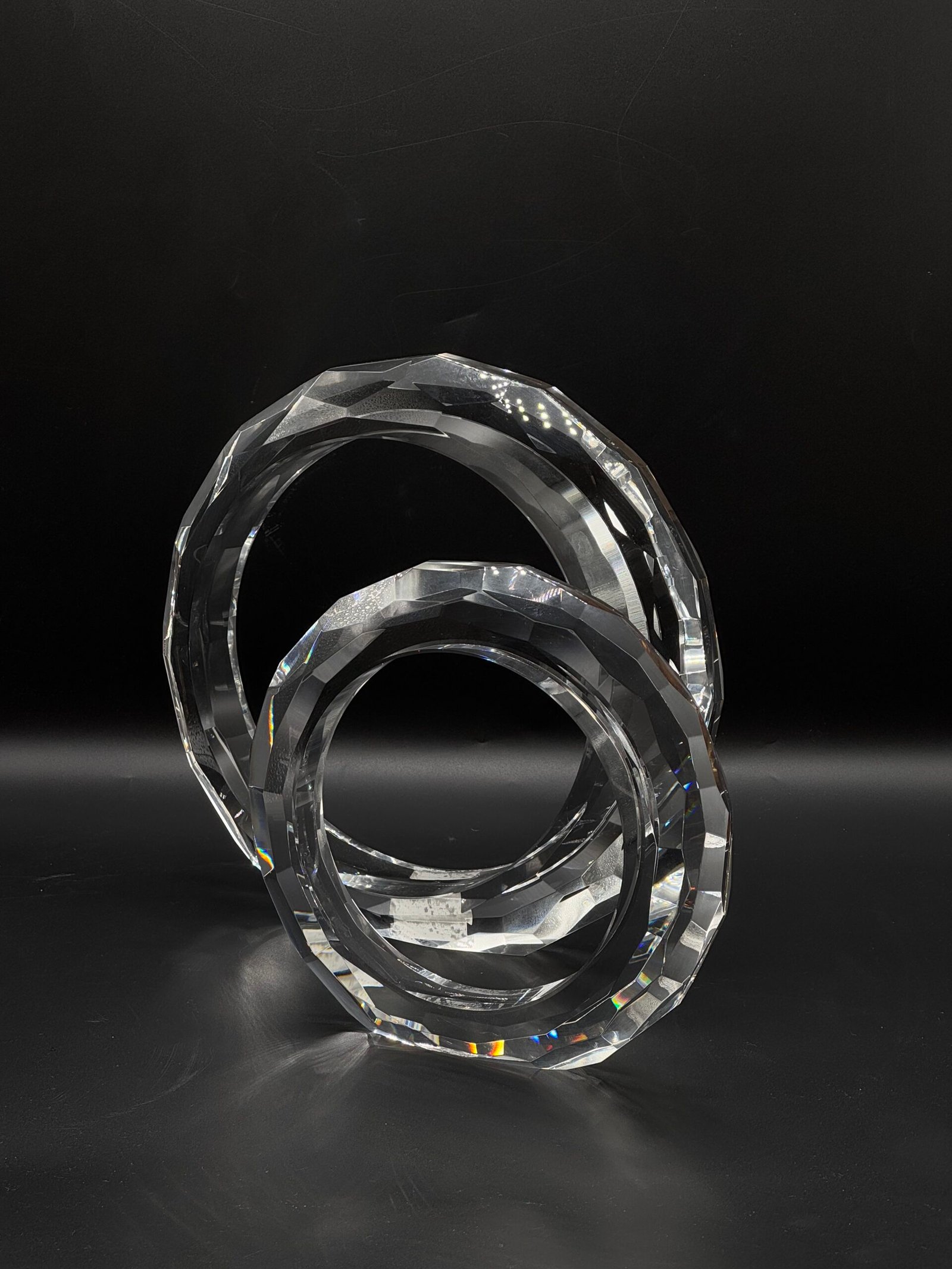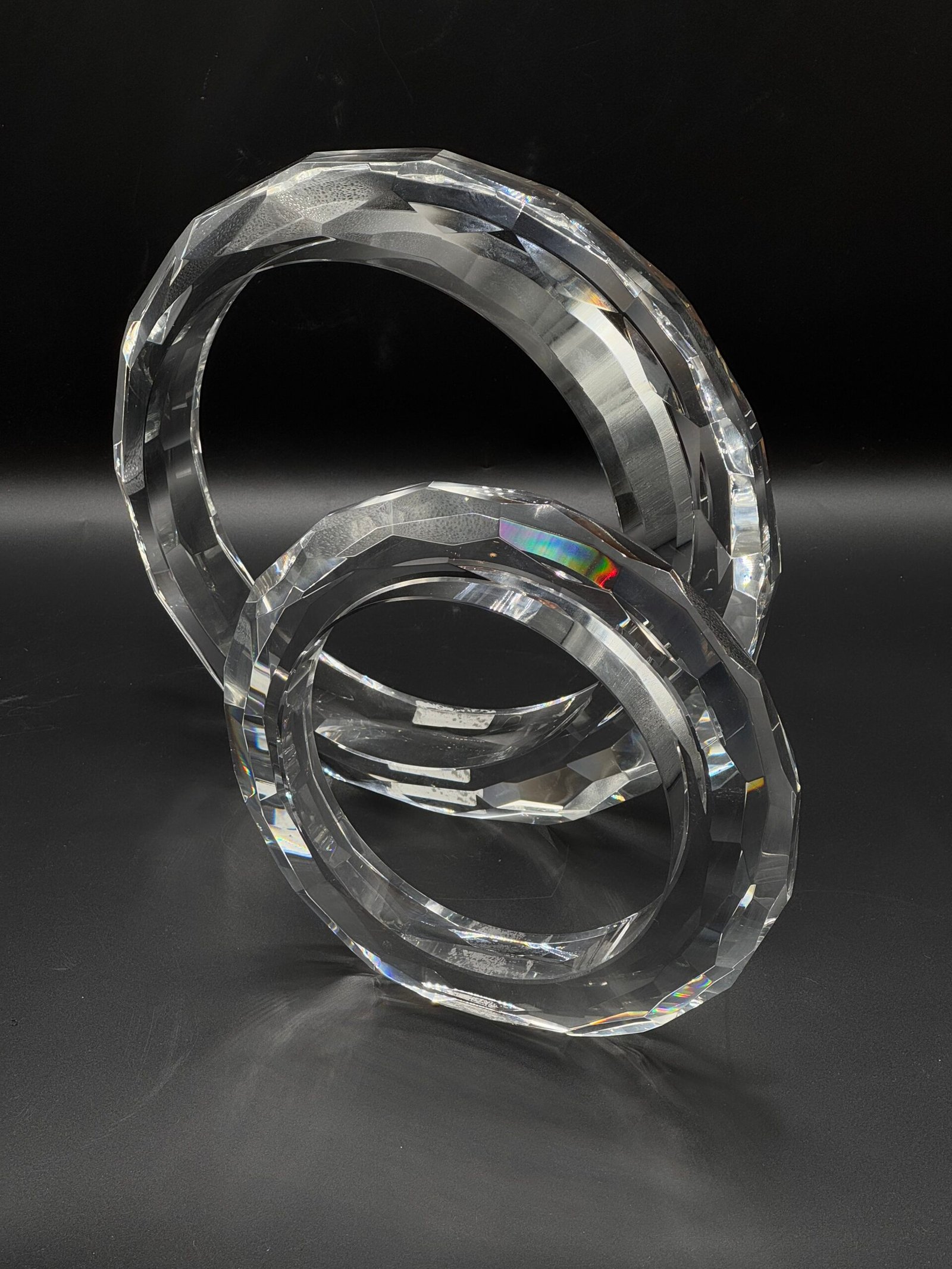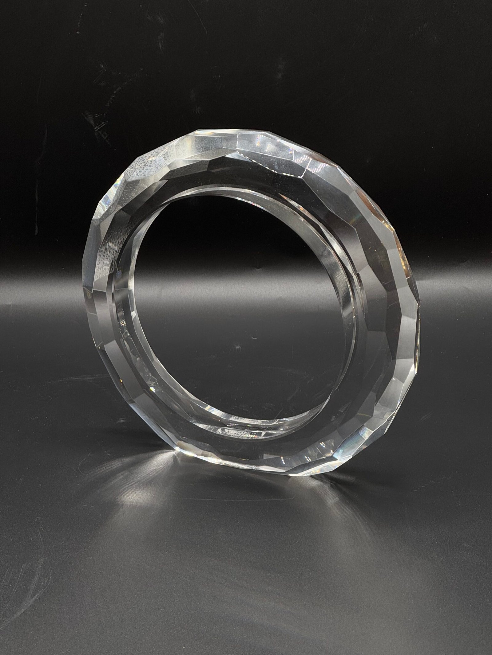 Petit objet décoratif en cristal transparent, façonné en anneau facetté. Sa surface taillée capte élégamment la lumière. Un accessoire chic et moderne, parfait pour sublimer une étagère ou un bureau.