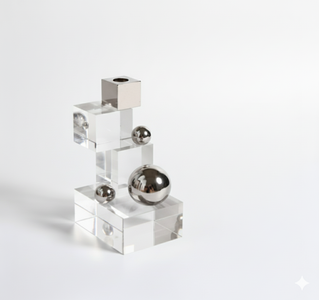 Elle est composée de plusieurs cubes en acrylique transparent, empilés de manière décalée pour créer une forme asymétrique et géométrique. Sur les cubes, on peut voir trois sphères en métal poli de différentes tailles, qui reflètent la lumière et l’environnement.