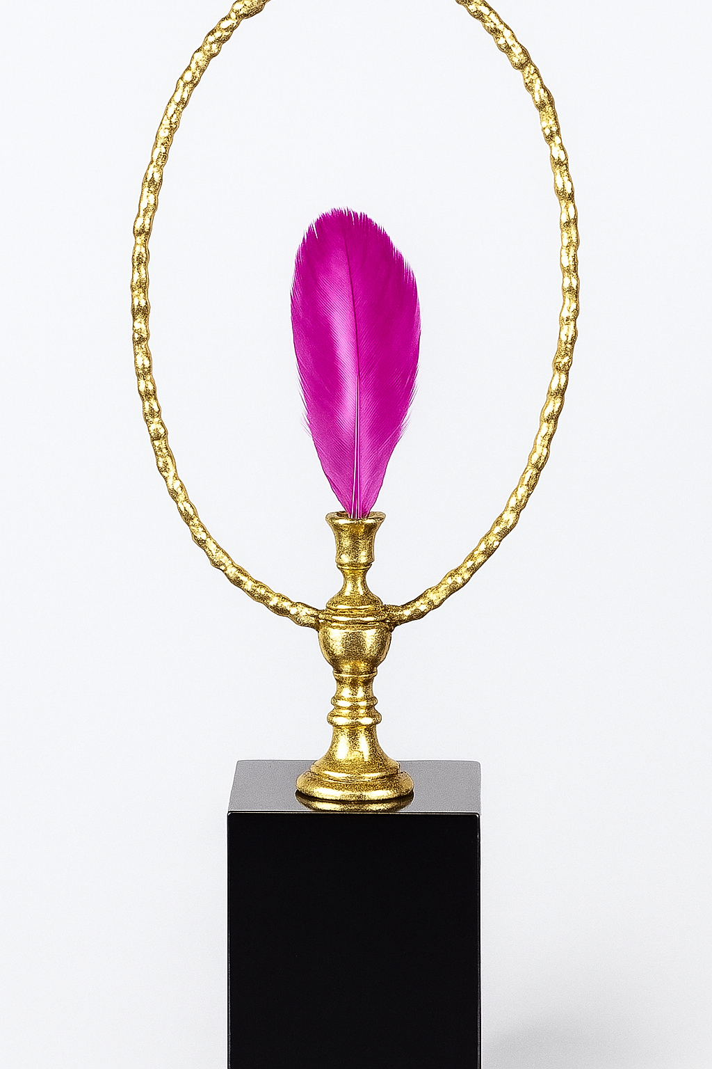 Elle se compose d’une plume fuchsia vive, placée au centre d’un anneau doré texturé au fini brillant, reposant sur un socle rectangulaire noir laqué.