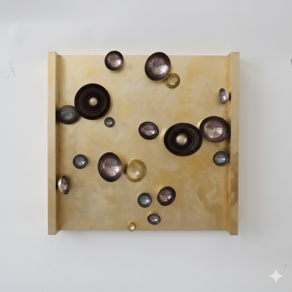 Cette décoration murale est une composition abstraite et contemporaine, mettant en scène une multitude de cercles et de disques métalliques de tailles variées. Certains présentent des reflets irisés, d’autres sont plus sombres et mats, tandis que des anneaux dorés viennent apporter éclat et contraste. L’ensemble est fixé sur une base dorée et disposé de façon asymétrique, évoquant des bulles en suspension ou un système de planètes flottant dans l’espace. C’est une pièce artistique originale qui combine modernité et élégance.
