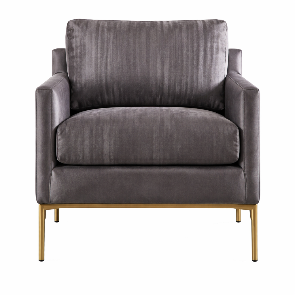 Les pieds fins en métal finition dorée apportent une touche haut de gamme et créent un contraste élégant avec le tissu sombre. Cette combinaison gris et doré renforce le caractère premium du fauteuil.