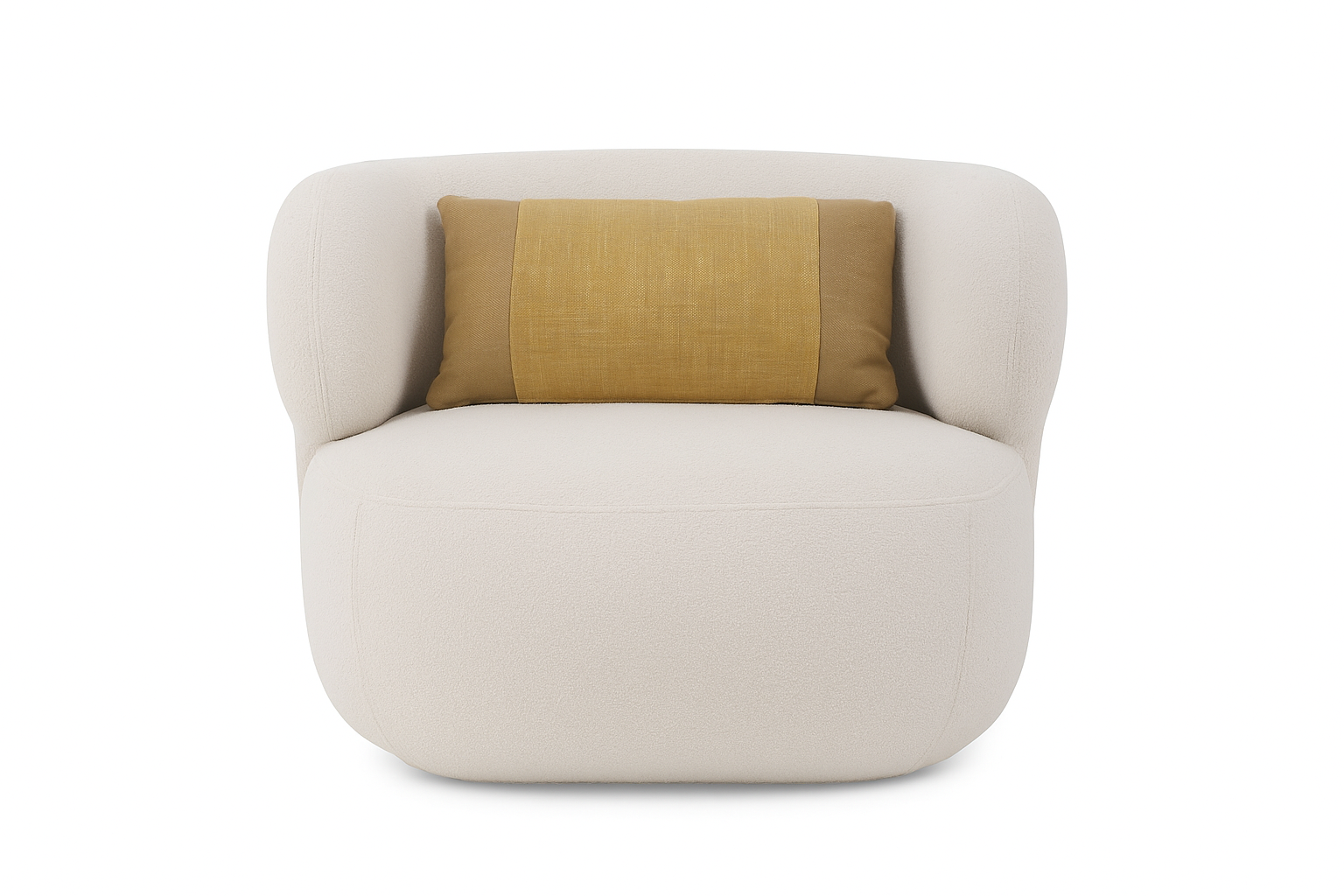Ce fauteuil présente un design contemporain aux formes généreuses et enveloppantes. Sa structure arrondie, sans angles vifs, lui confère une allure douce et accueillante. Il est entièrement tapissé d’un tissu bouclé écru, agréable au toucher et très tendance, apportant une note de confort et d’élégance.