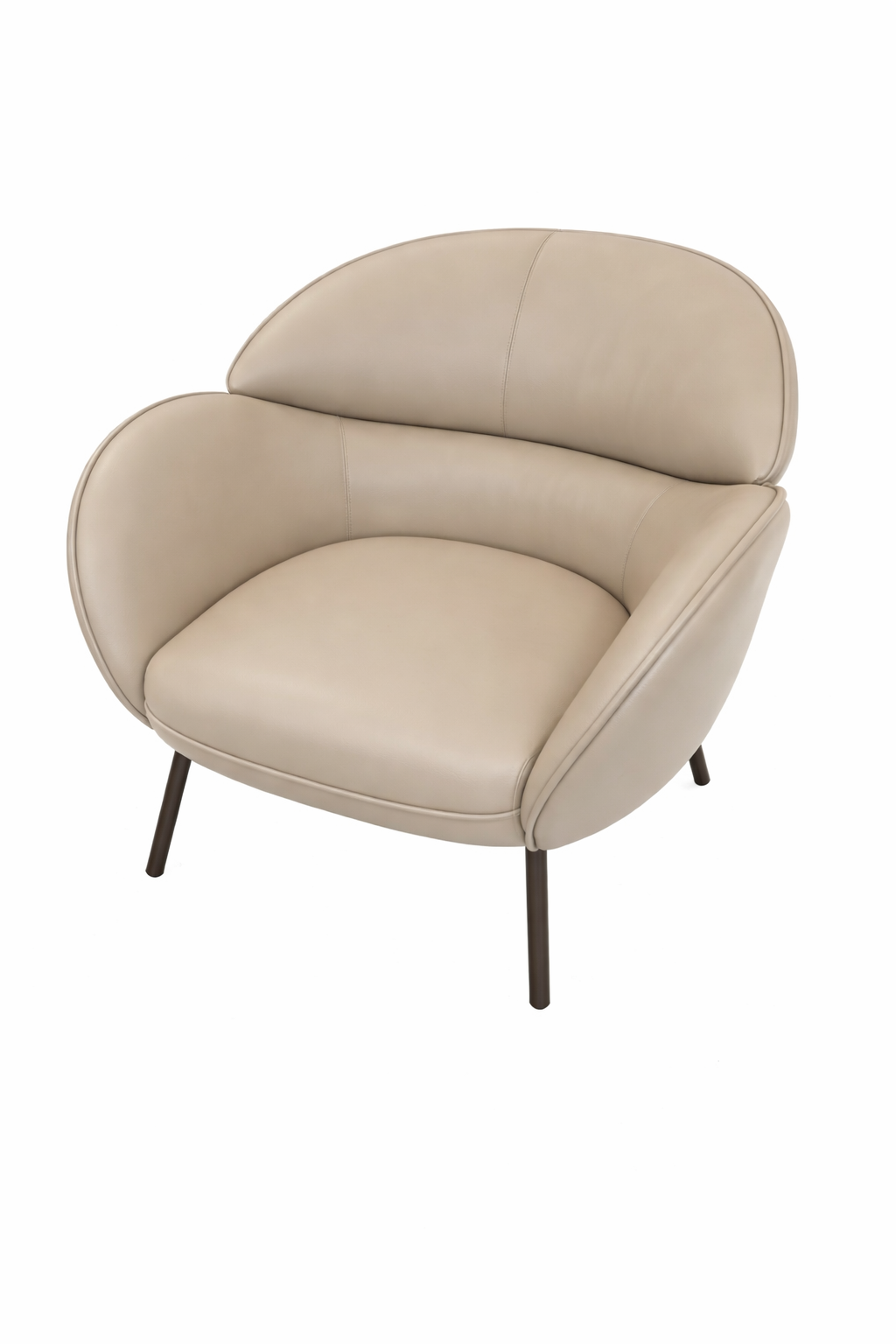 Son dossier arrondi, subtilement capitonné, épouse parfaitement le dos et offre un excellent maintien, tandis que les accoudoirs intégrés prolongent la forme cocon du fauteuil pour un confort optimal. L’assise généreuse et moelleuse garantit une expérience d’assise agréable, idéale pour les moments de détente.