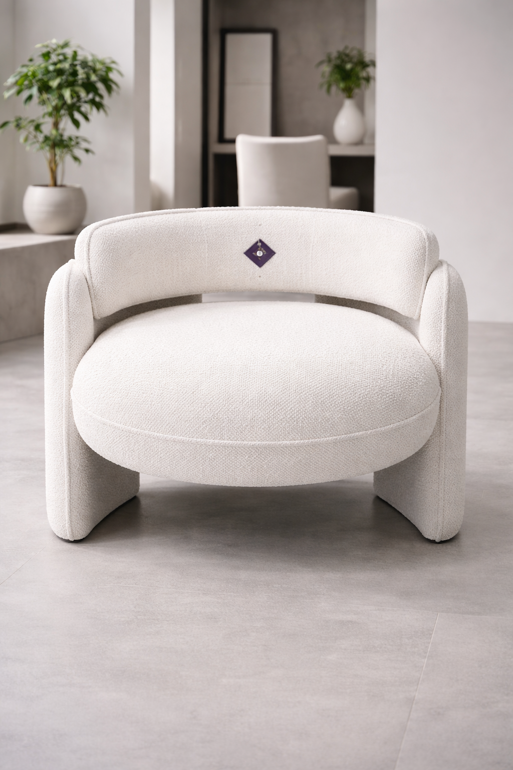 Sa forme arrondie et compacte, avec un dossier semi-circulaire et des accoudoirs intégrés, crée une assise accueillante et ergonomique. L’assise est large et généreusement rembourrée, assurant un excellent confort au quotidien. Les pieds discrets, intégrés à la structure, renforcent son style épuré et contemporain.