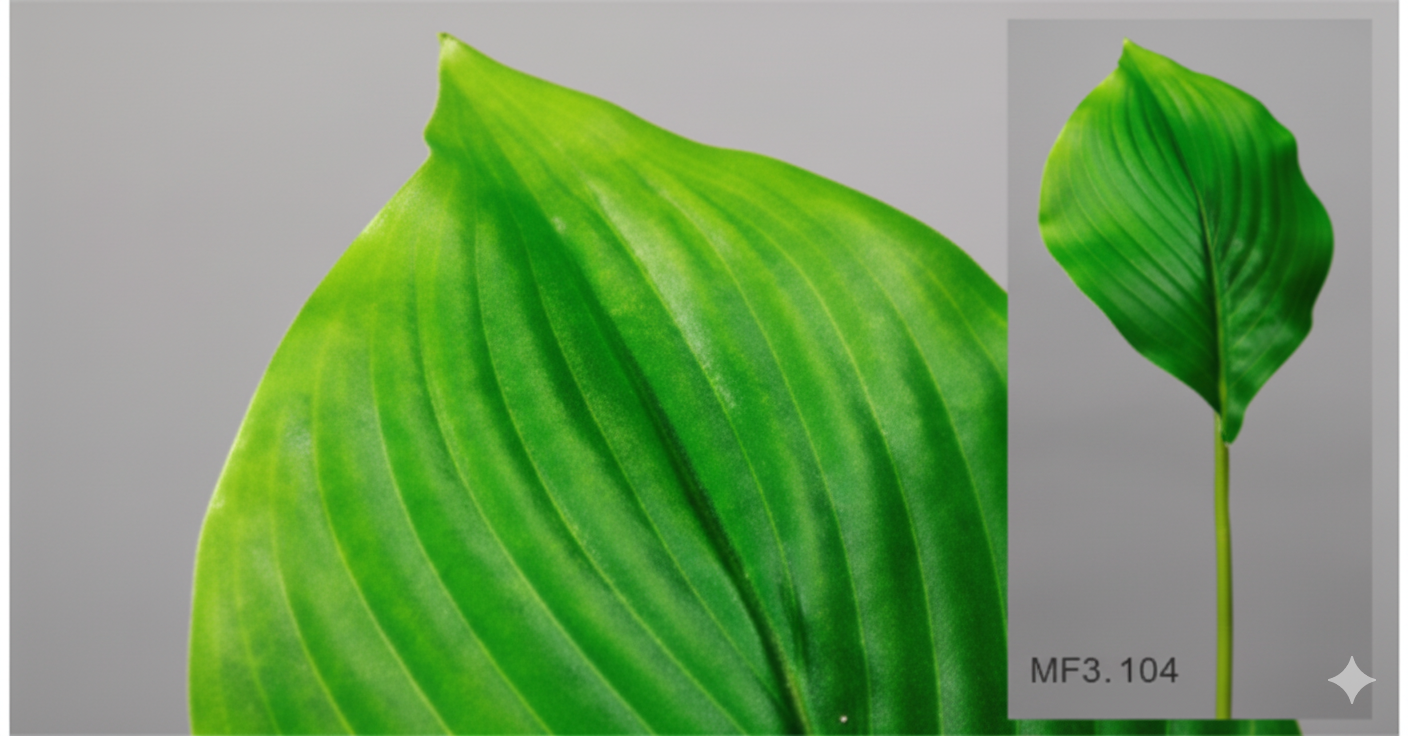 Feuille de plante artificielle d’un vert vif et luxuriant. À gauche, un gros plan met en valeur la texture détaillée de la feuille, avec ses nervures parallèles bien marquées qui créent un effet strié très réaliste.