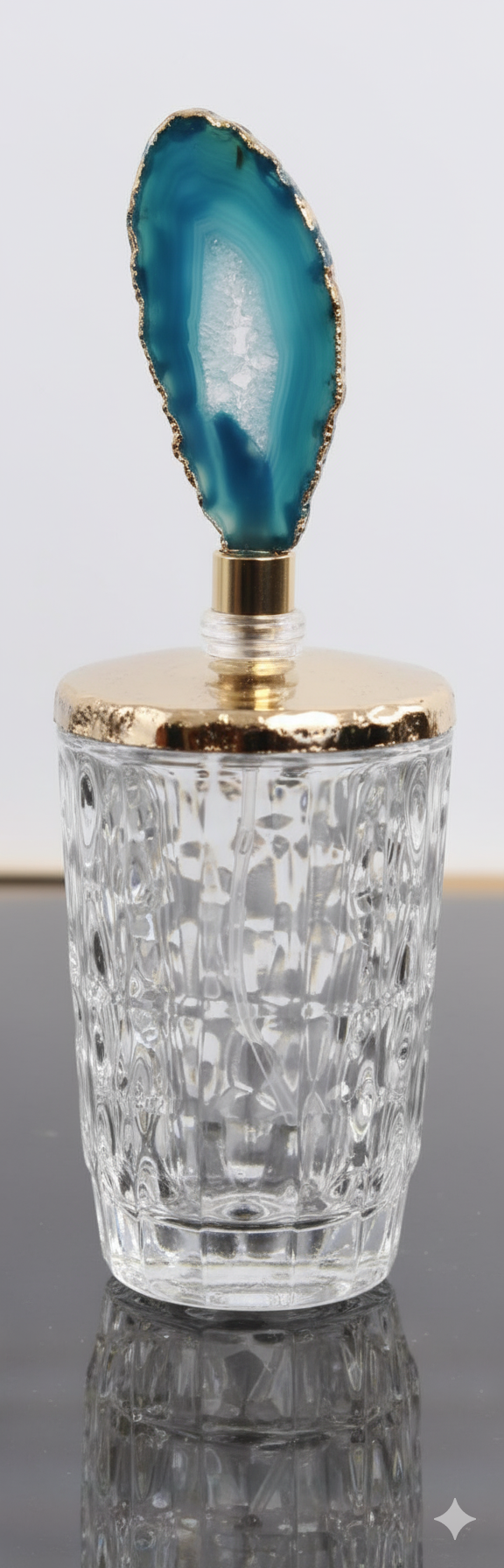 Son corps en verre taillé capte la lumière avec éclat, tandis que son col doré texturé met en valeur un superbe bouchon en agate bleue naturelle, souligné d’un délicat liseré doré.