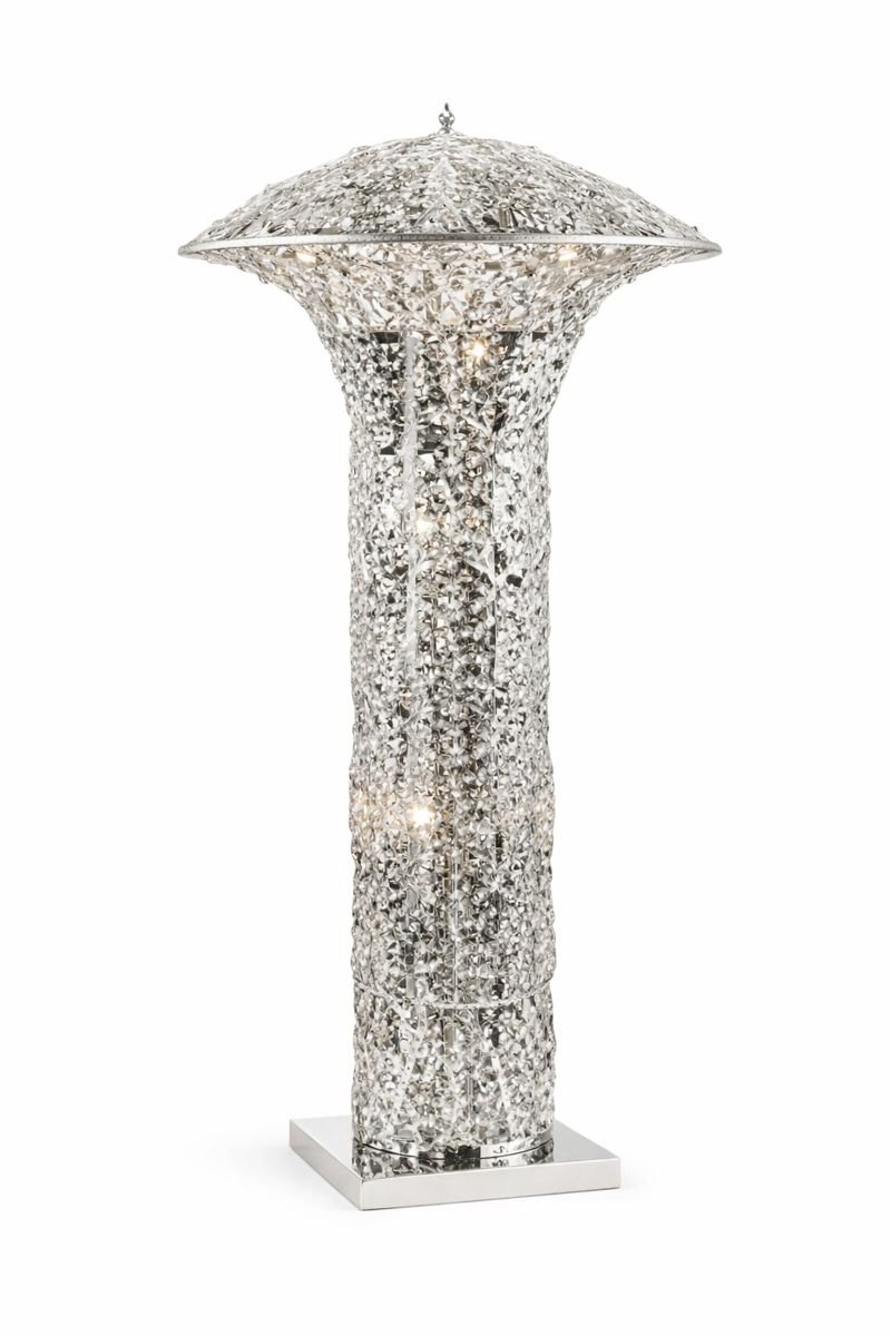 Corps en cristal : L’ensemble du lampadaire est habillé de cristaux finement assemblés, créant une surface riche et scintillante. Les multiples facettes captent et reflètent la lumière pour un effet brillant et sophistiqué.