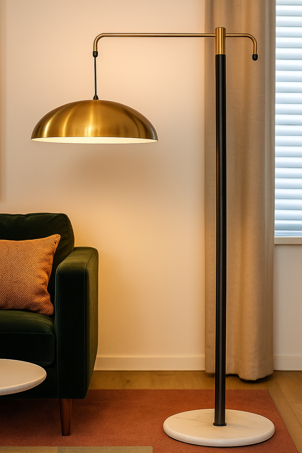 • Abat-jour : Doré (laiton brossé), demi-sphérique avec finition métallique brillante.