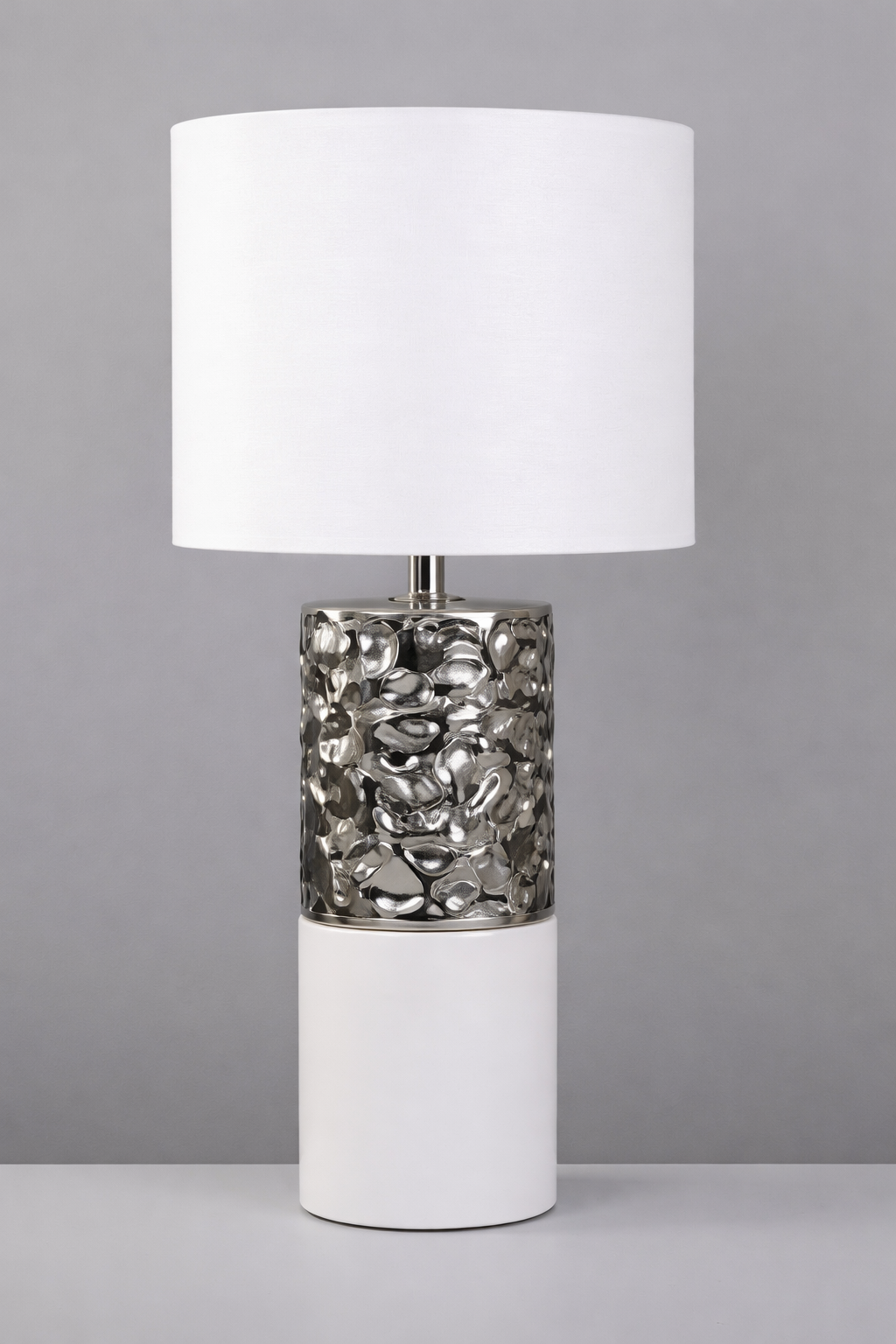 • La partie supérieure est en métal chromé poli, avec un motif texturé en relief rappelant des galets ou des formes organiques. Cet effet sculpté capte la lumière et apporte une touche luxueuse et artistique.