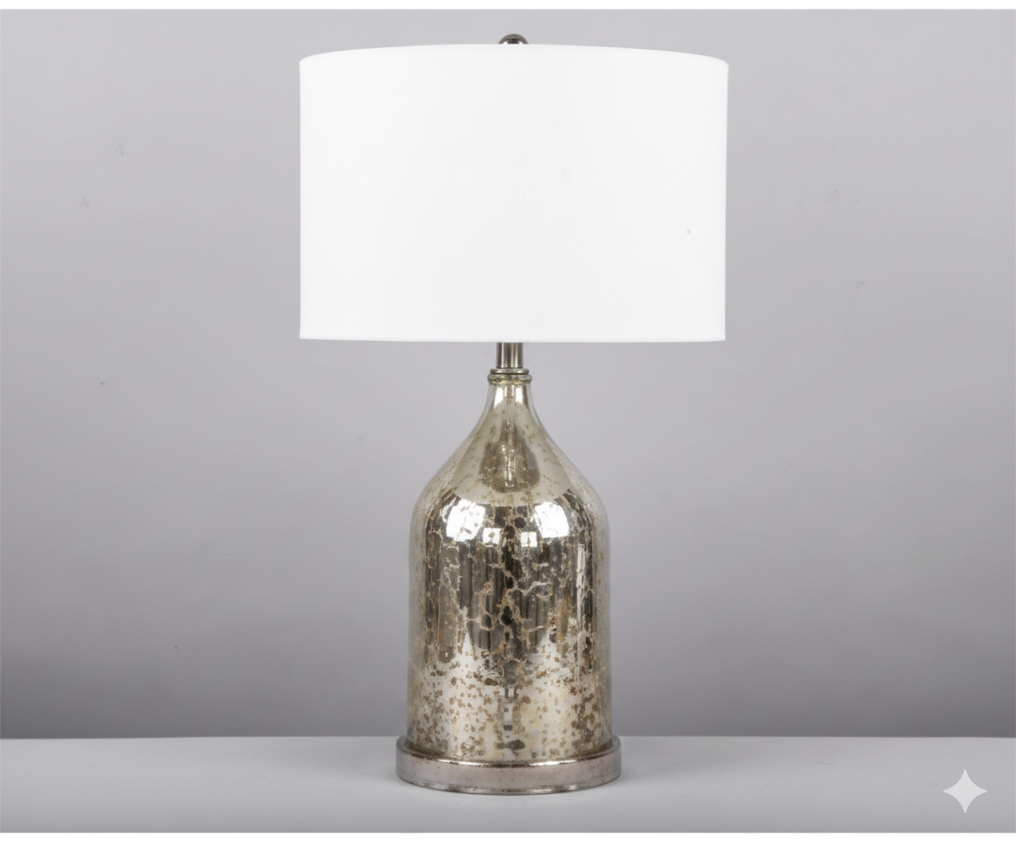 Elle décrit une lampe en verre mercuré patiné, de style vintage / shabby chic, alors que la lampe de la photo est clairement moderne, contemporaine et structurée, avec un pied métallique chromé texturé et une base blanche mate.