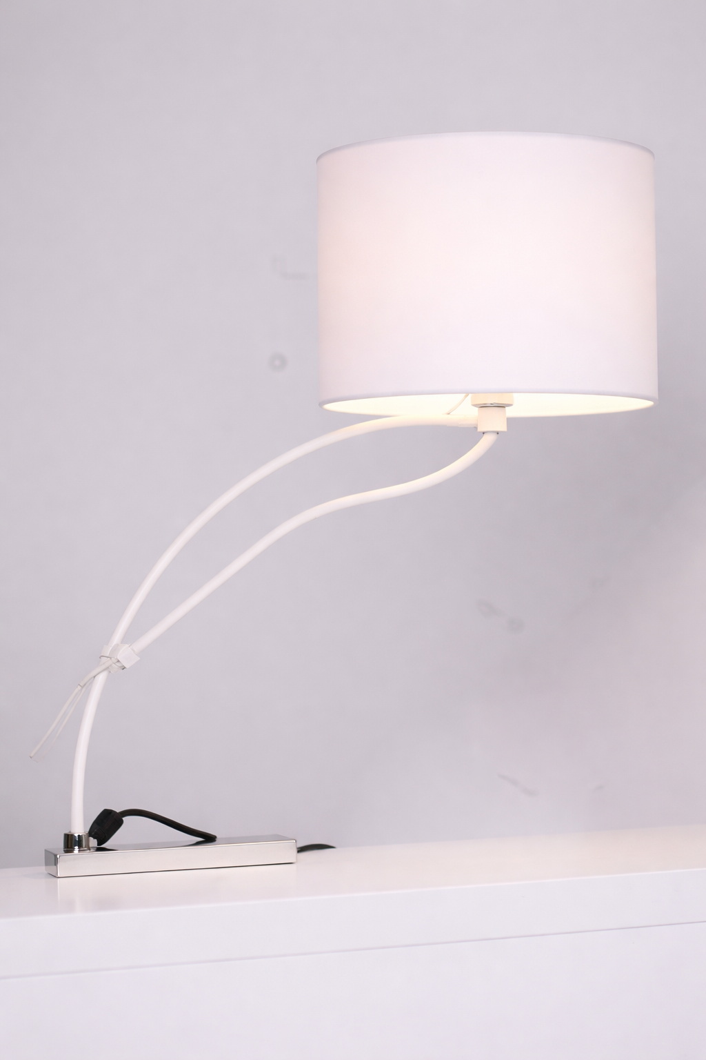 L’abat-jour adopte une forme cylindrique (tambour) en tissu, qui diffuse une lumière douce et homogène. Sa ligne droite contraste harmonieusement avec la courbure du bras.