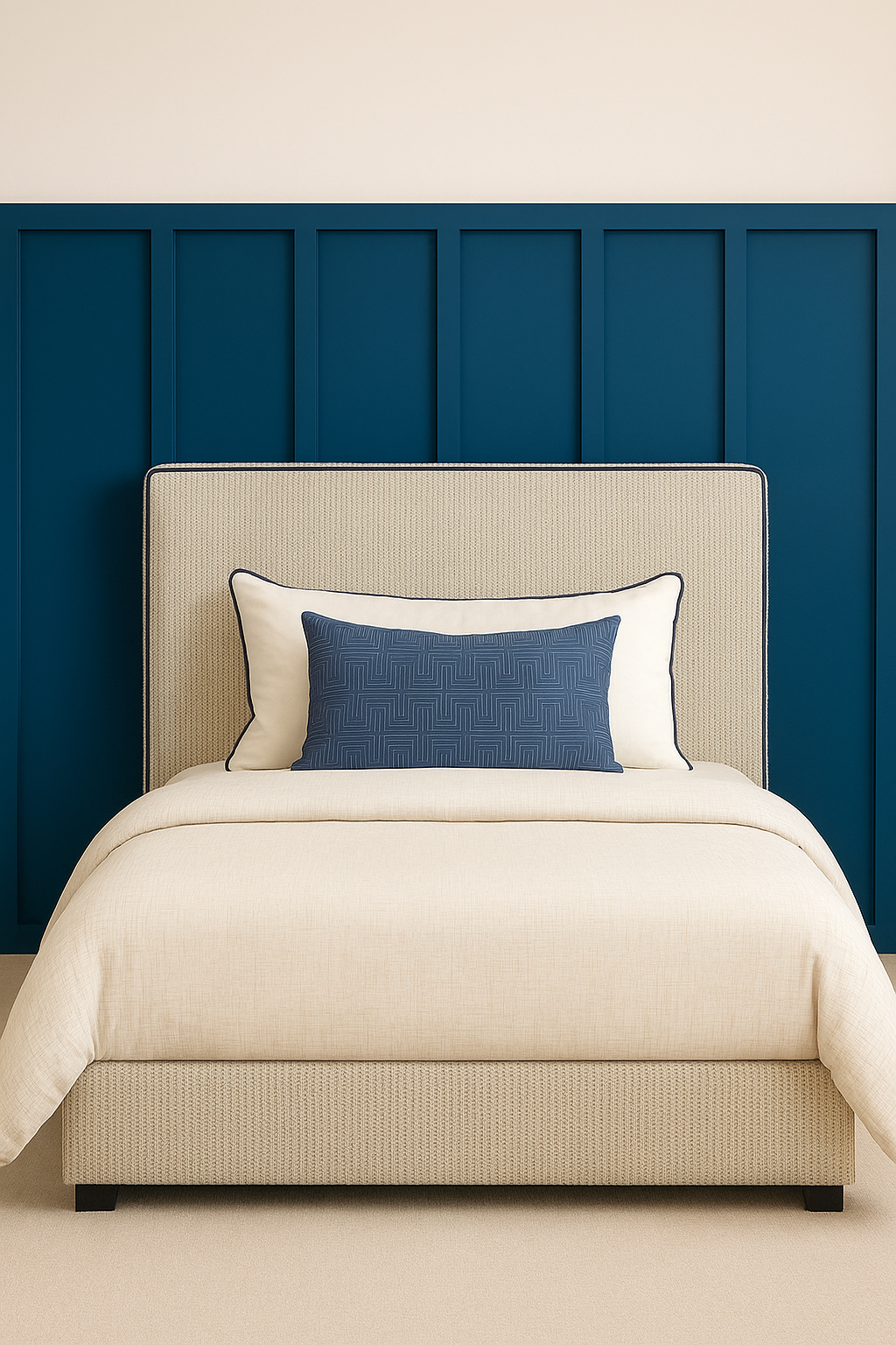 • Décoration et literie : Le lit est habillé d’une parure sobre dans les tons ivoire et crème. Un coussin rectangulaire bleu à motifs géométriques apporte une touche graphique et harmonise l’ensemble avec le mur bleu profond.