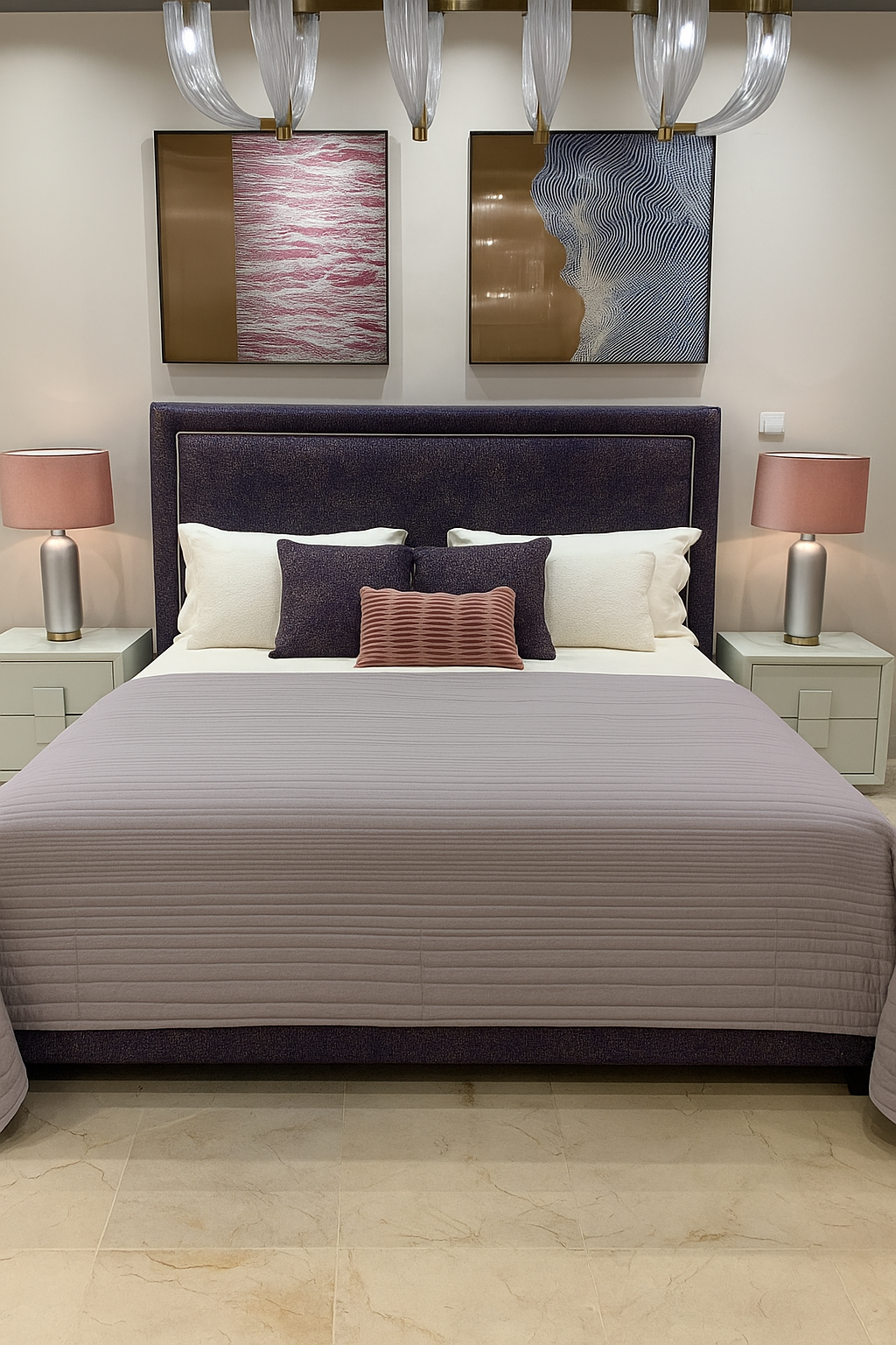 • Tête de lit : large et généreusement rembourrée, elle est revêtue d’un tissu texturé violet profond à reflets gris. Un fin liseré clair en souligne le contour, apportant une touche de finition chic et structurée.