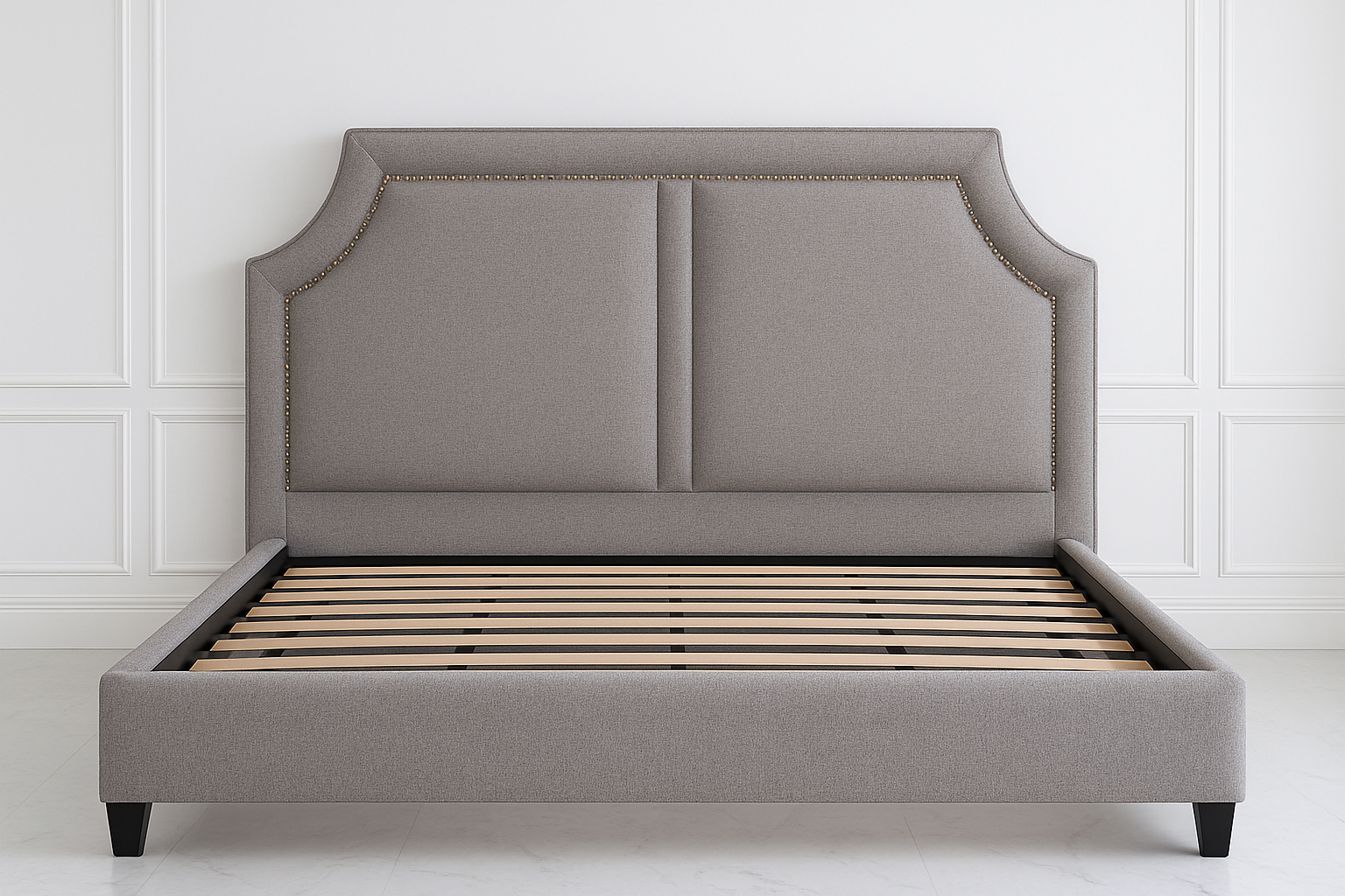 La tête de lit, majestueuse et finement galbée, se distingue par son design sophistiqué : deux panneaux rembourrés verticaux encadrés d’un liseré orné de clous décoratifs couleur bronze, symbole de soin et de qualité artisanale.