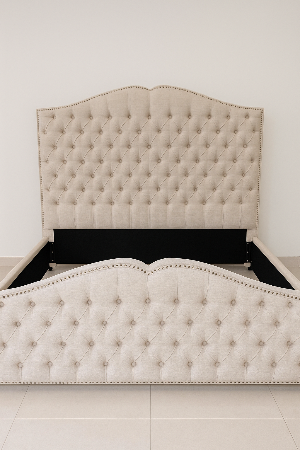 • Tête de lit : haute et majestueuse, elle est capitonnée avec des boutons disposés en motifs losange, créant un effet matelassé très sophistiqué. La forme supérieure est légèrement ondulée, apportant une touche de douceur et de raffinement.
