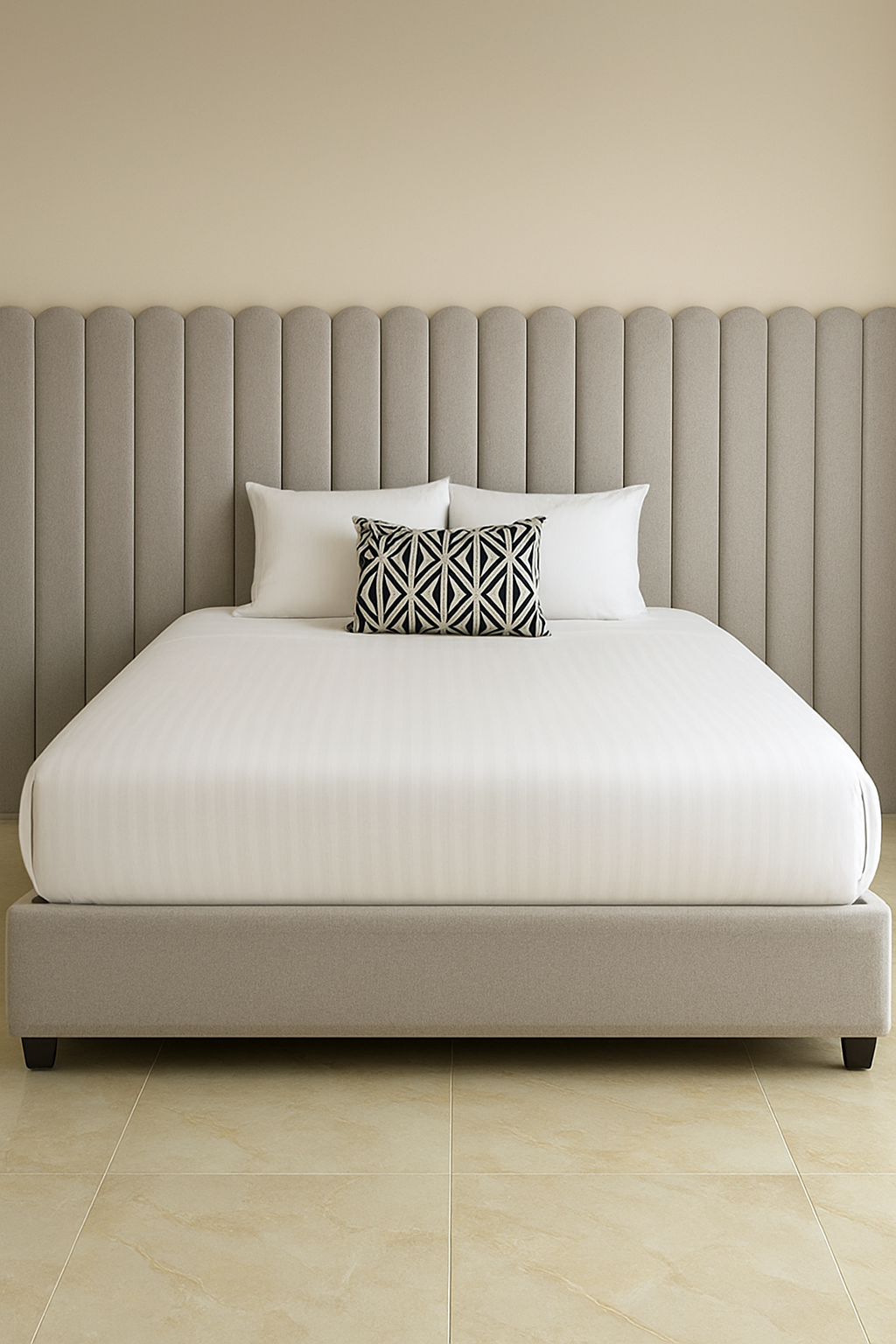 Tête de lit : imposante et capitonnée, elle est composée de panneaux verticaux arrondis revêtus d’un tissu gris clair. Sa forme répétitive et douce crée un effet visuel harmonieux et sophistiqué, tout en apportant une touche de confort et de luxe.