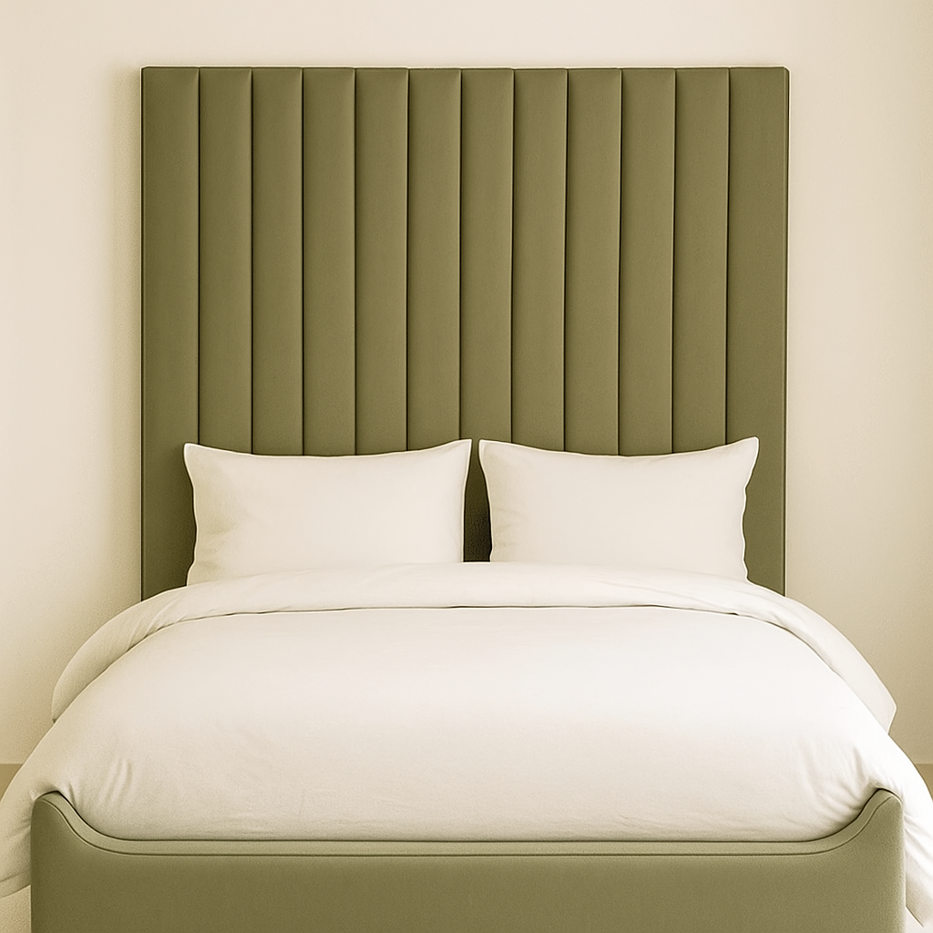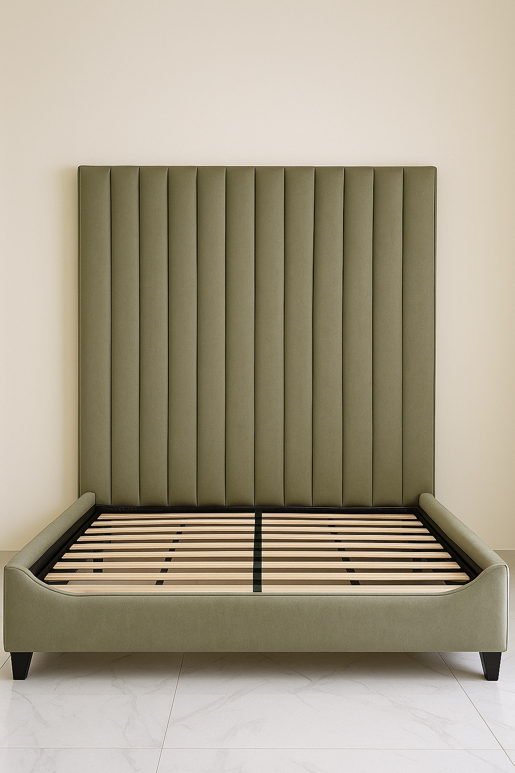 Sa tête de lit haute, composée de panneaux verticaux rembourrés, crée un effet de hauteur et de profondeur tout en apportant un confort optimal pour la lecture ou la détente. La texture du tissu, douce au toucher et d’une finition mate, renforce le caractère chaleureux de l’ensemble.