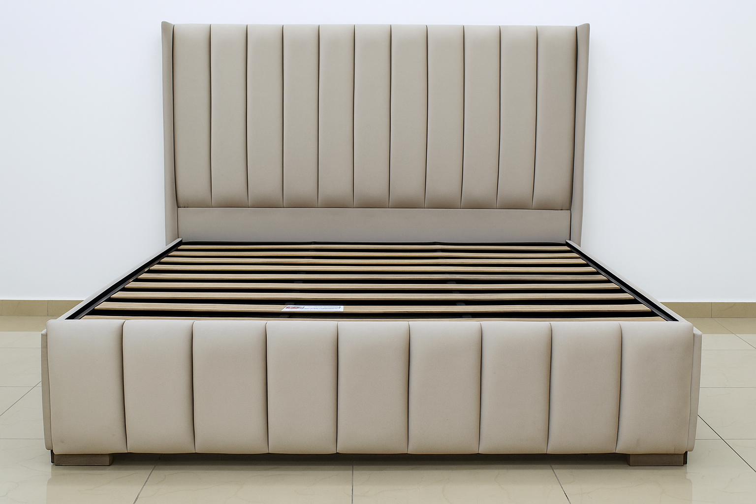 Le cadre du lit, assorti à la tête de lit, reprend le même style rembourré avec des panneaux verticaux, conférant une harmonie d’ensemble.