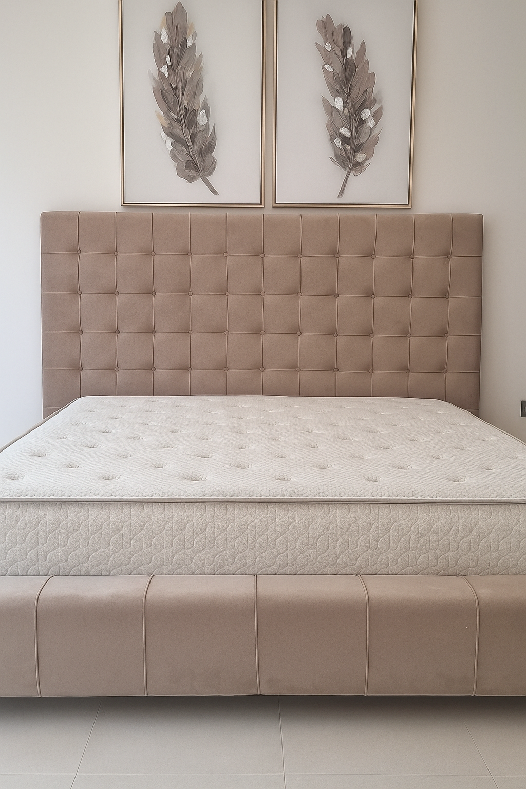 Tête de lit : grande et capitonnée, elle est revêtue d’un tissu velouté beige taupe, avec un quadrillage régulier de boutons qui lui donne un aspect luxueux et moelleux.