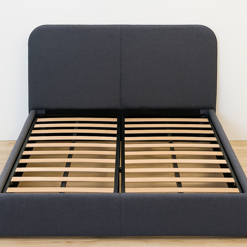 Le sommier est composé de lattes en bois clair soutenues par une armature métallique noire, assurant une bonne solidité et un excellent maintien du matelas. L’ensemble repose sur un sol en bois clair, renforçant la sensation de chaleur et de modernité. Ce lit s’intègre parfaitement dans une chambre au style épuré ou scandinave.