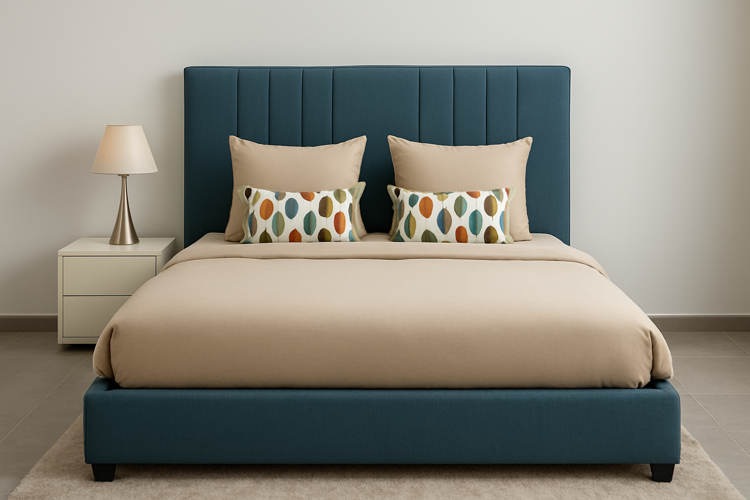 Le cadre du lit, assorti à la tête de lit, est bas et massif, offrant une allure stable et équilibrée. Le linge de lit beige crée un contraste doux avec le bleu, donnant une ambiance chaleureuse et apaisante.