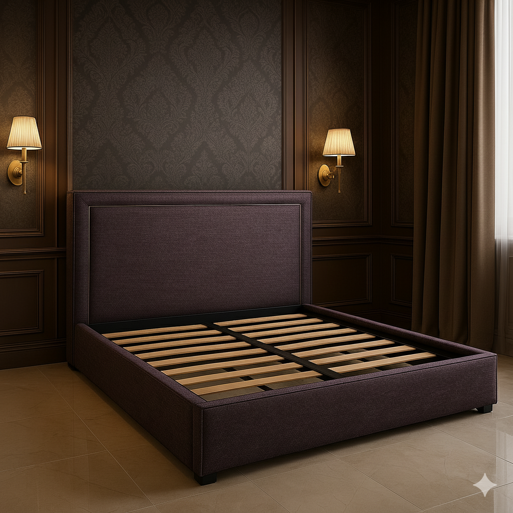 Ce lit raffiné séduit par son revêtement en tissu tapissé couleur prune/aubergine, une teinte profonde et chaleureuse qui apporte une touche de caractère et de sophistication à la chambre.