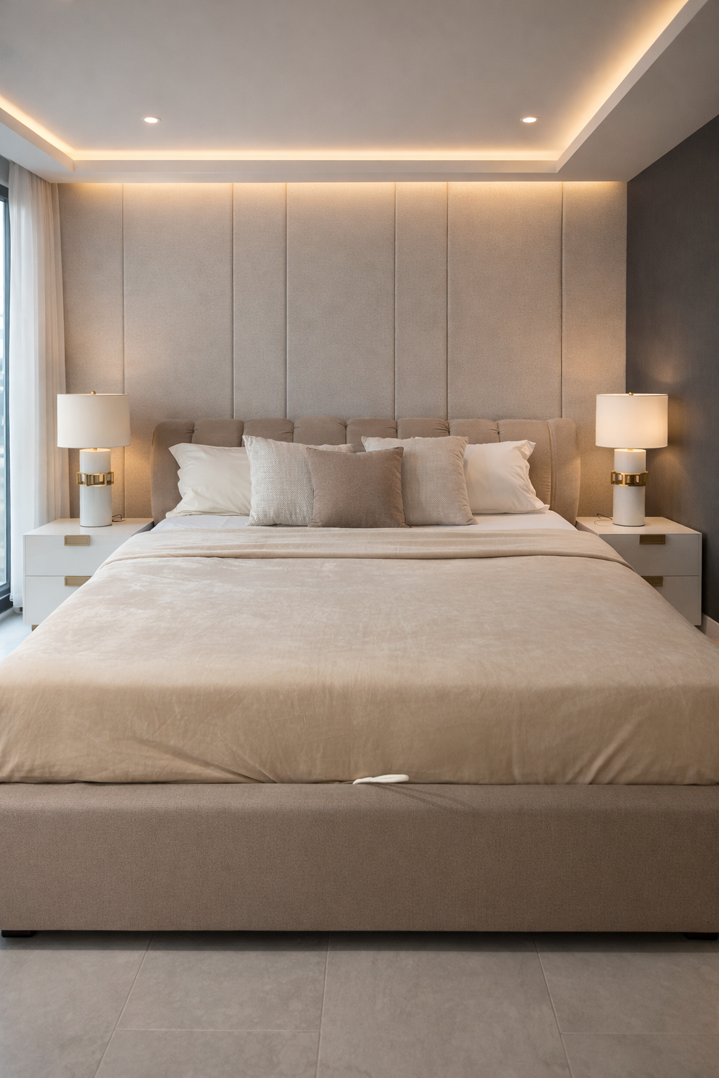 De chaque côté du lit, il y a des tables de chevet blanches et modernes, chacune surmontée d’une lampe de table avec un abat-jour blanc et une base décorative en or et blanc. Le tout est posé sur un sol carrelé de marbre clair, avec des motifs veinés naturels. L’ambiance générale est celle d’une chambre à coucher confortable et élégante.