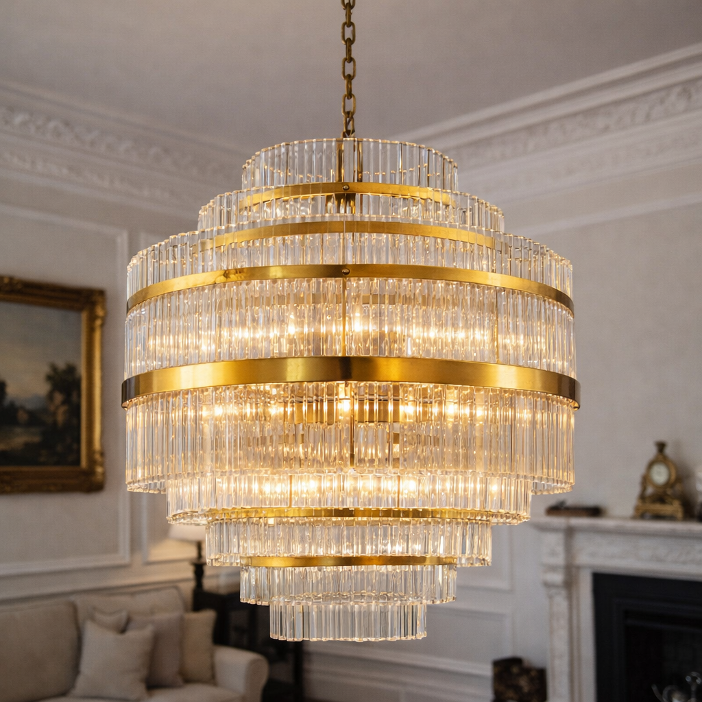 Il est composé de rangées circulaires superposées, formant une silhouette cylindrique à étages. Chaque niveau est habillé de tiges en verre transparent disposées verticalement, créant un effet de cascade lumineux très élégant. Le verre clair permet une diffusion optimale de la lumière tout en produisant de subtils reflets scintillants.