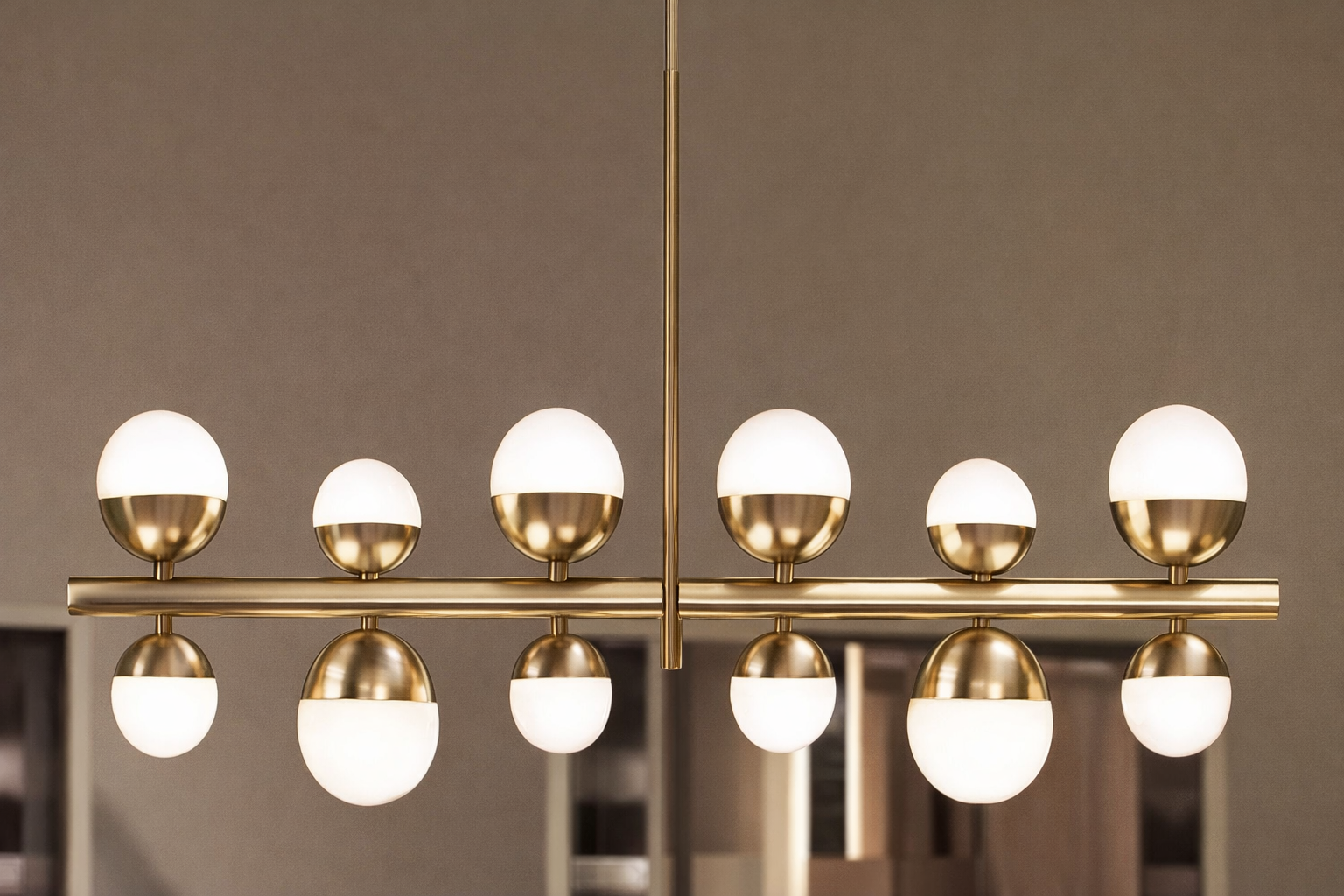 Ce modèle se distingue par sa structure horizontale en métal finition dorée (laiton brossé), suspendue par une tige centrale fine et épurée. Il est composé de globes en verre opalin blanc, répartis harmonieusement sur deux niveaux (haut et bas), offrant une diffusion de lumière douce, homogène et chaleureuse.