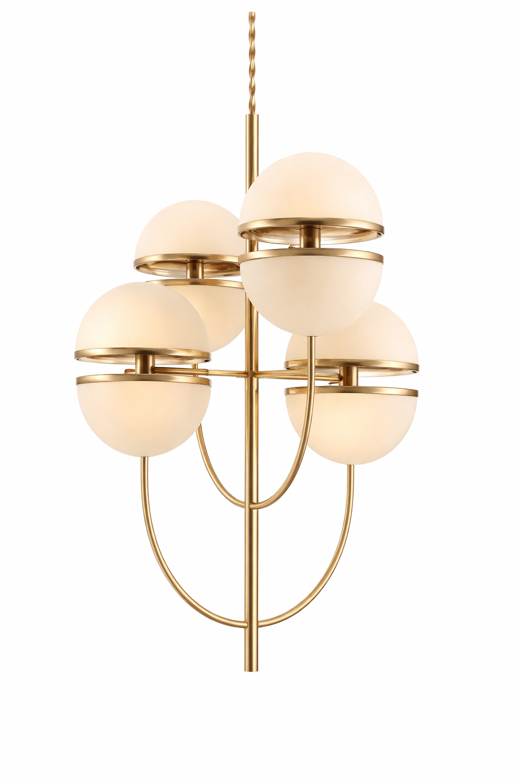 La structure centrale et les bras courbés en métal doré forment une silhouette équilibrée et aérienne, donnant au lustre un aspect à la fois décoratif et sophistiqué. Le câble de suspension assorti renforce l’harmonie de l’ensemble.