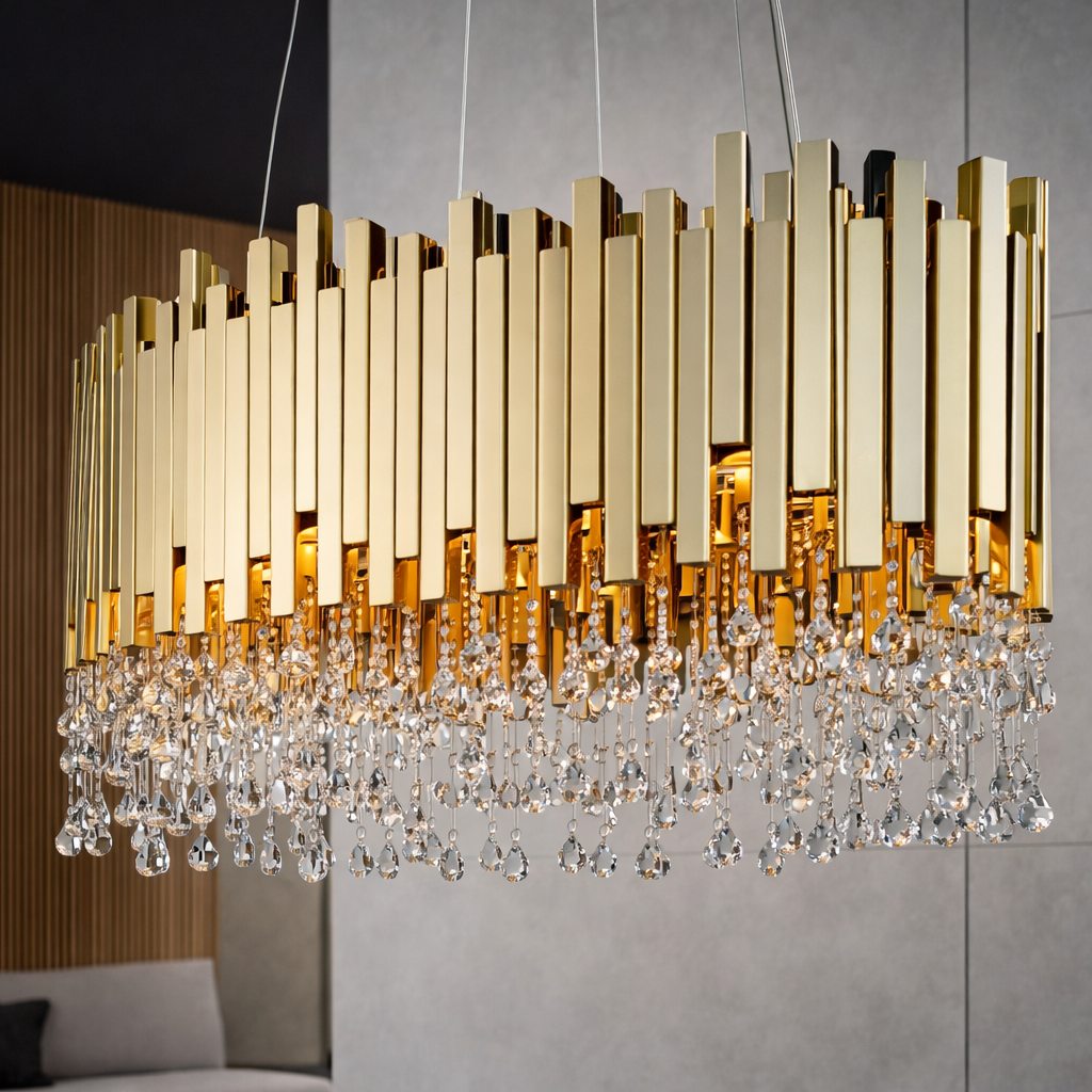 Lustre suspendu au style luxueux et contemporain, caractérisé par une forme rectangulaire élégante. Il est composé d’une structure en métal finition dorée, constituée de multiples lamelles verticales disposées de manière régulière, créant un effet graphique et sophistiqué.